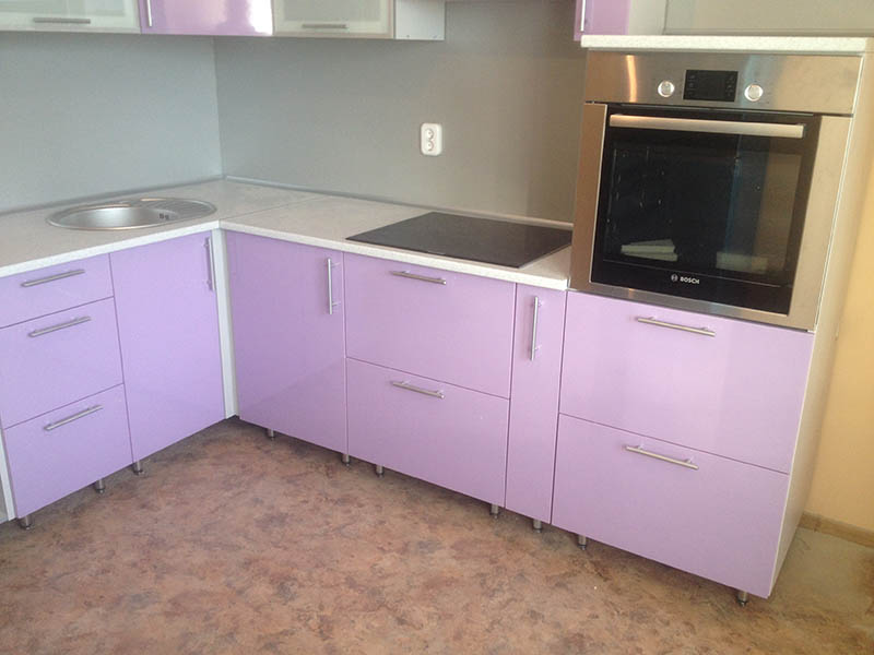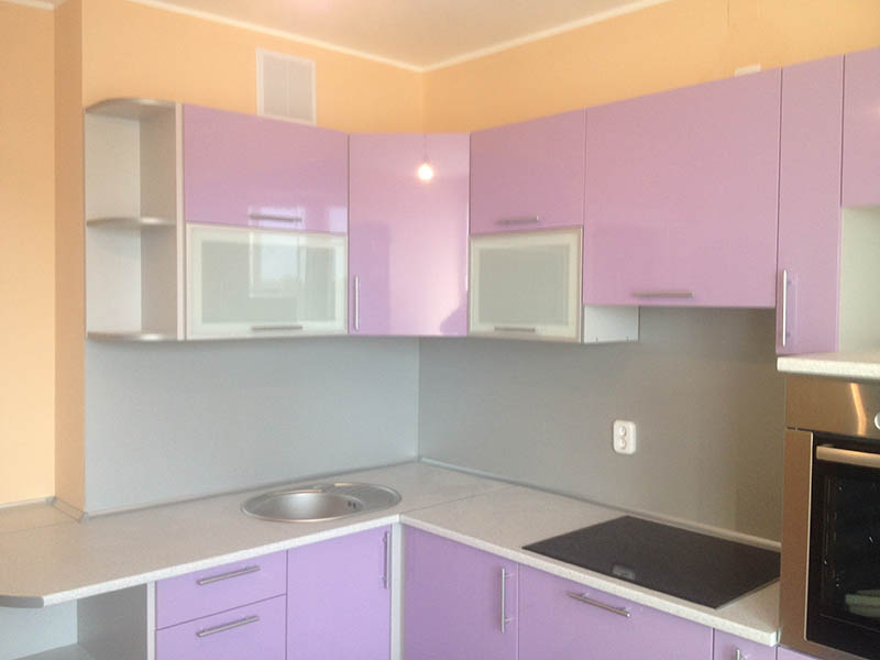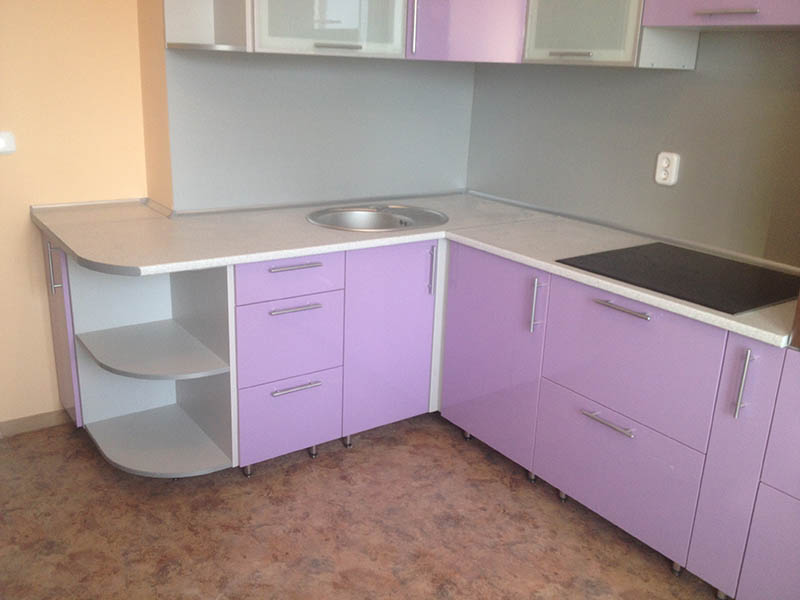 Кухня в нежном сиреневом цвете — отличное решение для обустройства светлой и просторной комнаты. Открытые полочки позволят разместить любые предметы декора, которые станут украшением кухонного интерьера. Предусмотрено также наличие открытых ниш для духового шкафа и микроволновой печи.