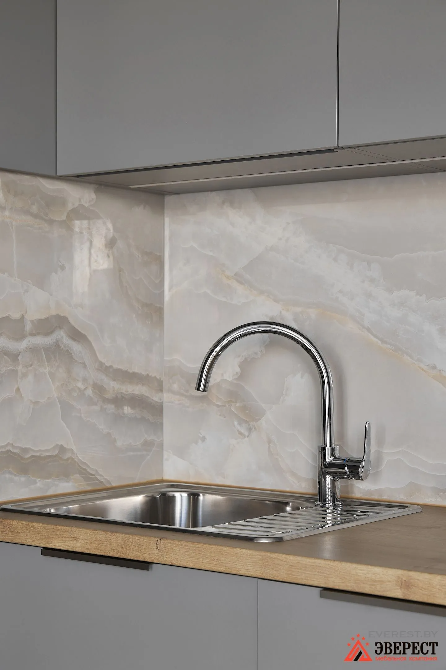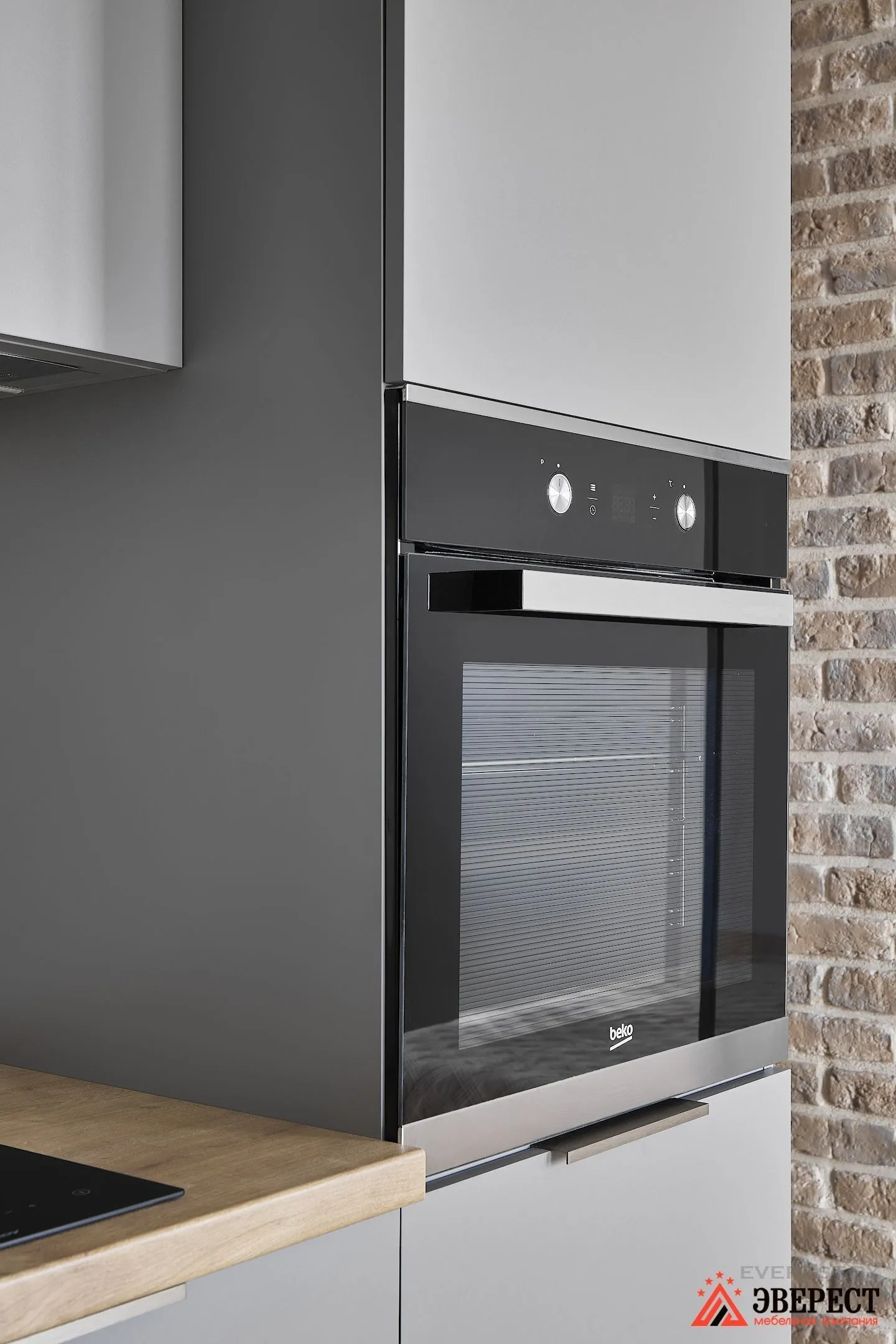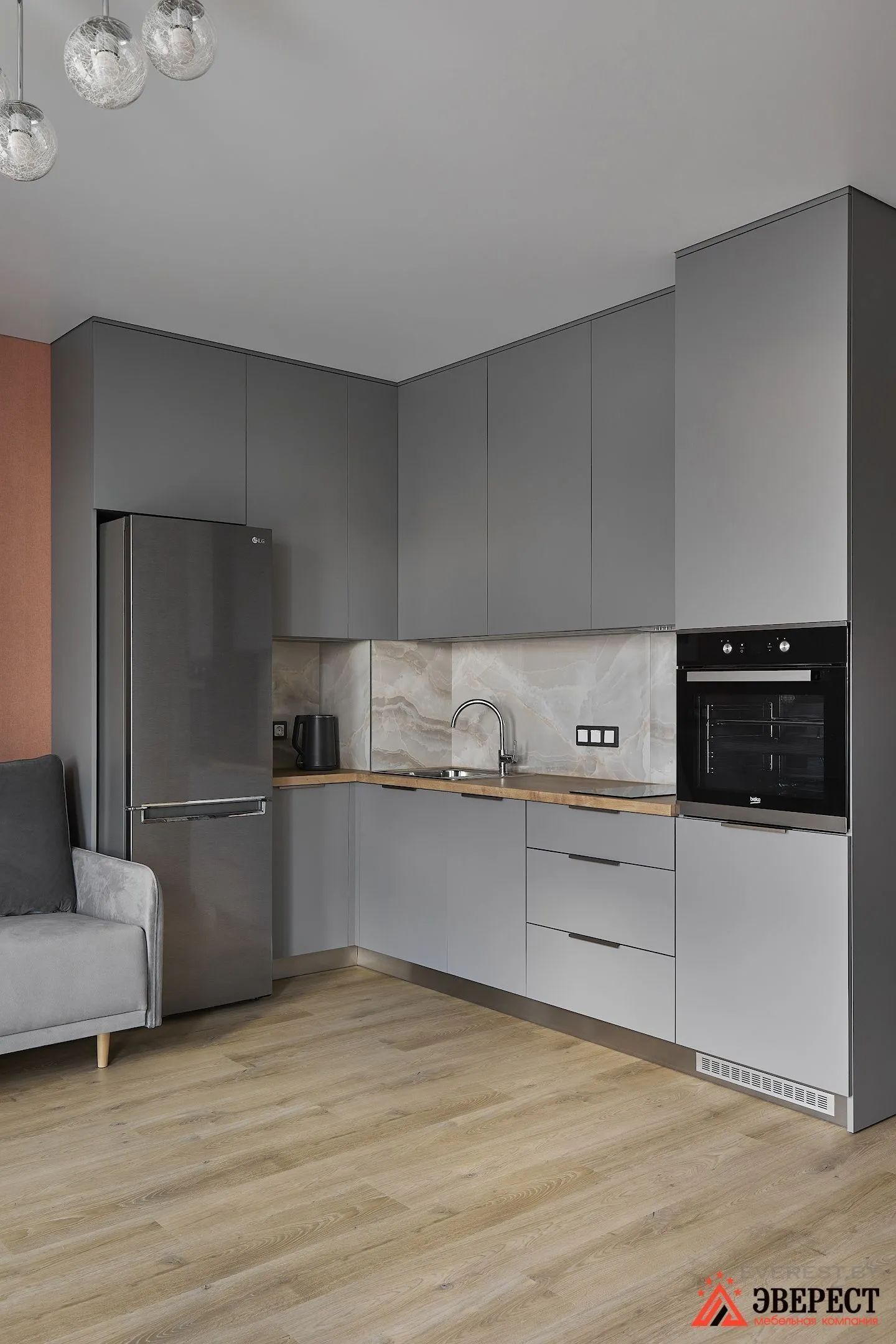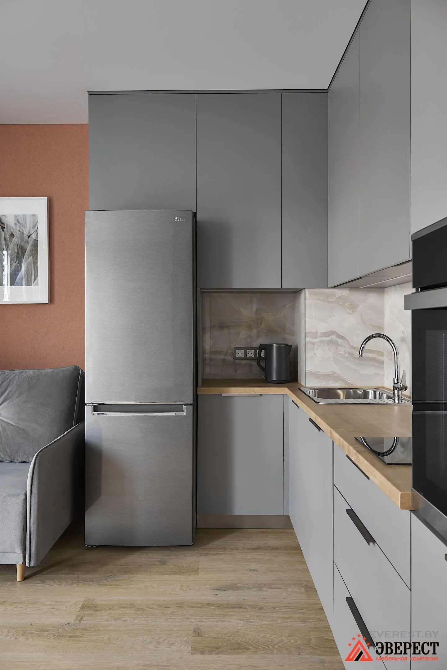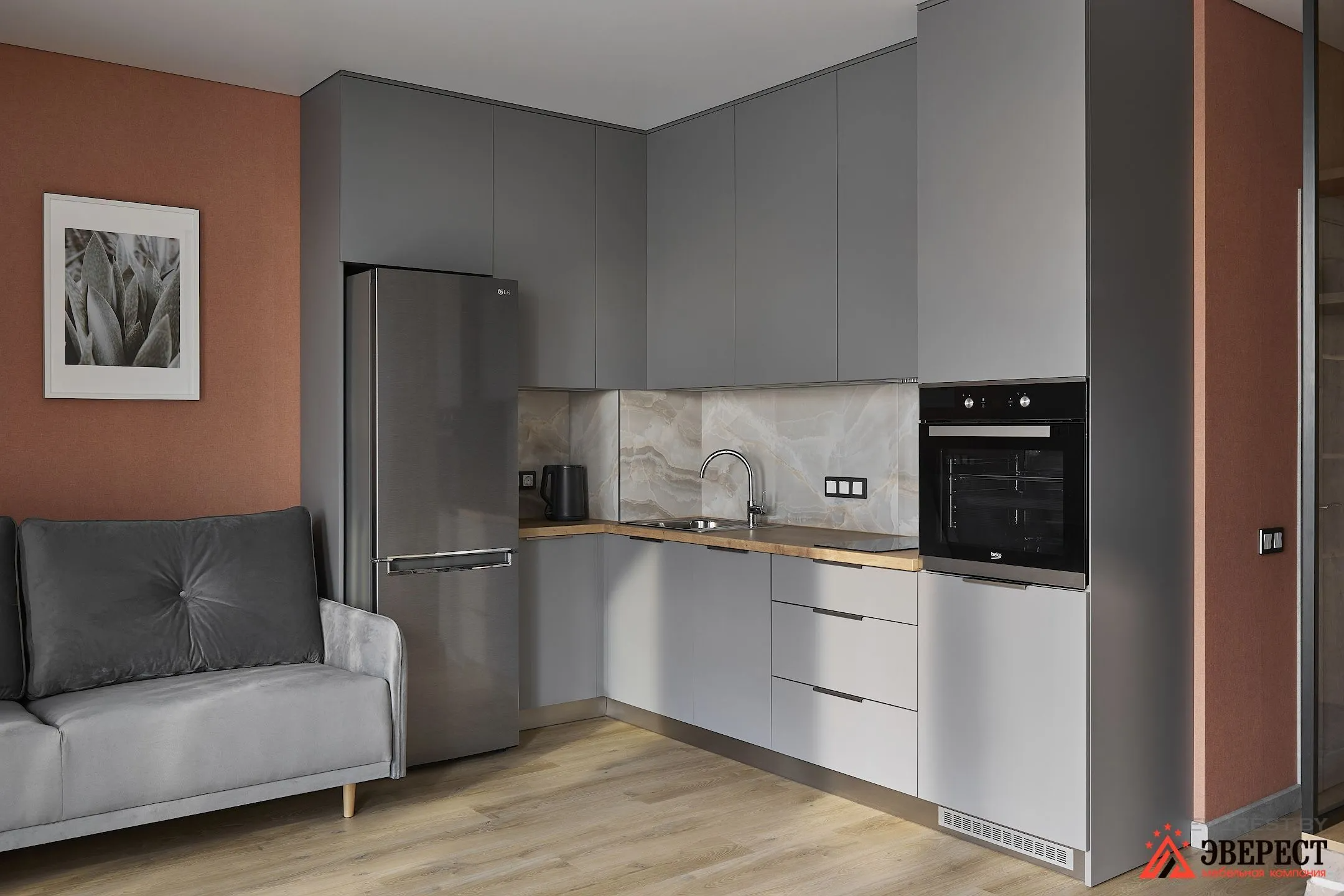 Перед вами небольшая угловая кухня, выполненная из матовых серых фасадов. Контрастом для фасадов стали столешница и фартук внутри гарнитура. А вот в самом помещении ему контрастируют стены.