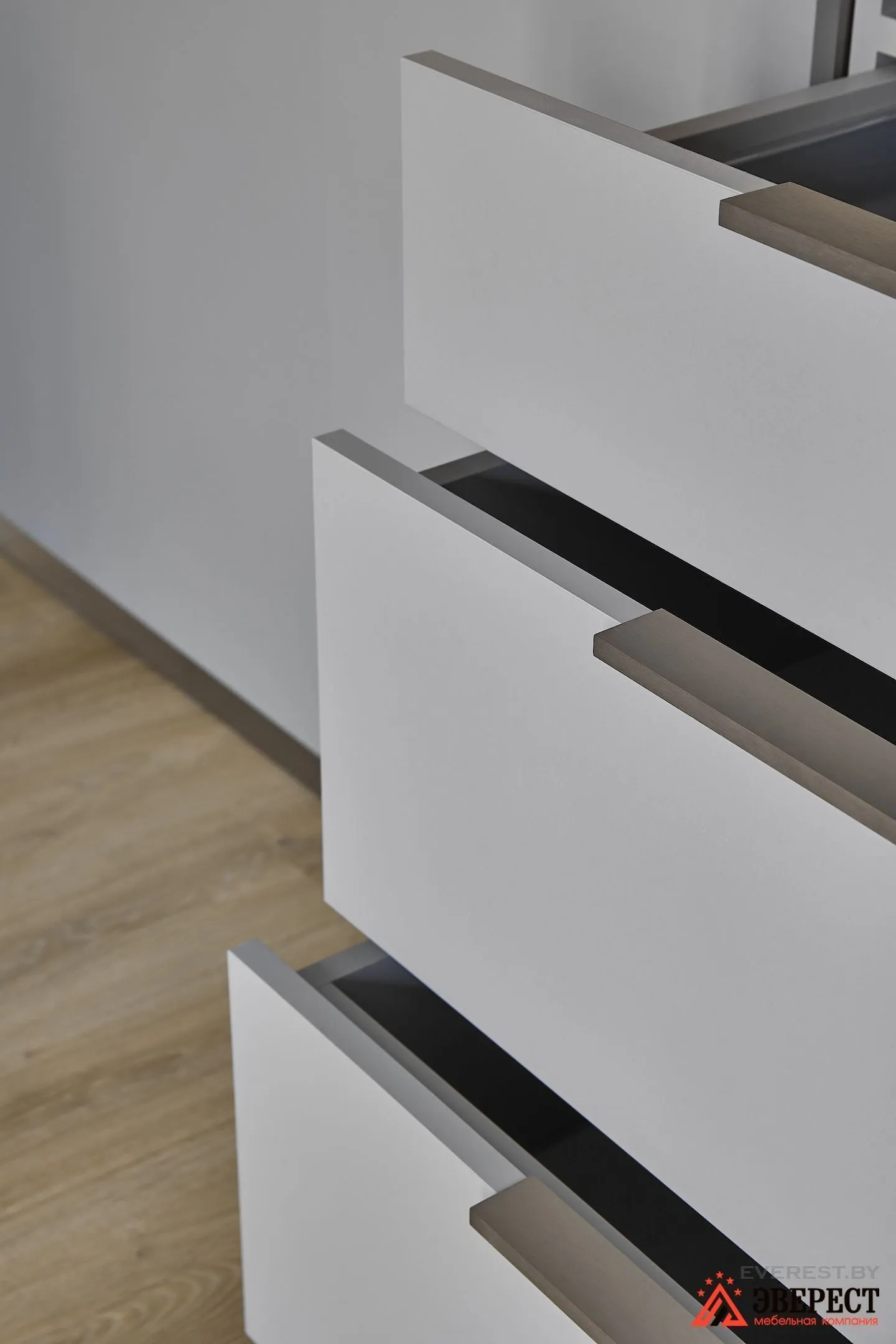 Шкафы и ящики в нижнем ряду открываются с помощью торцевых ручек, которые не выделяются на общем фоне.