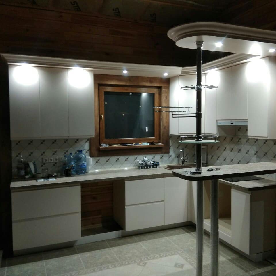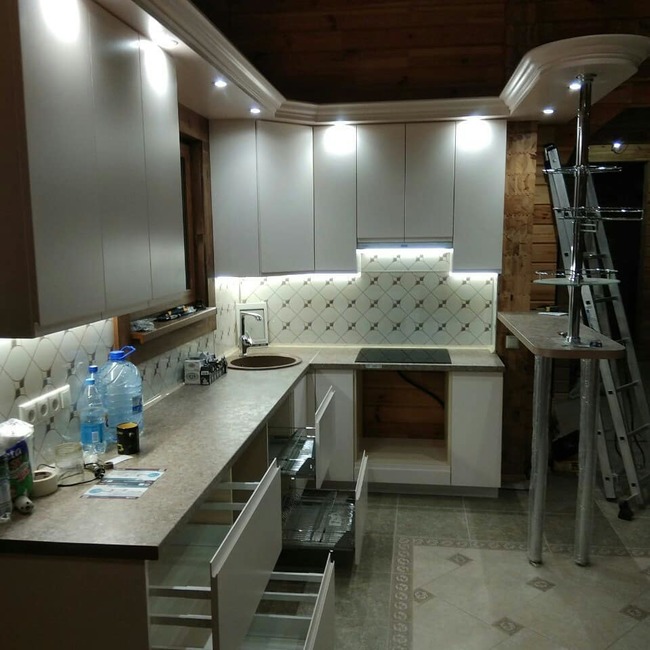 Глянцевые фасады без ручек, множество шкафчиков и ящиков, качественные материалы и фурнитура.