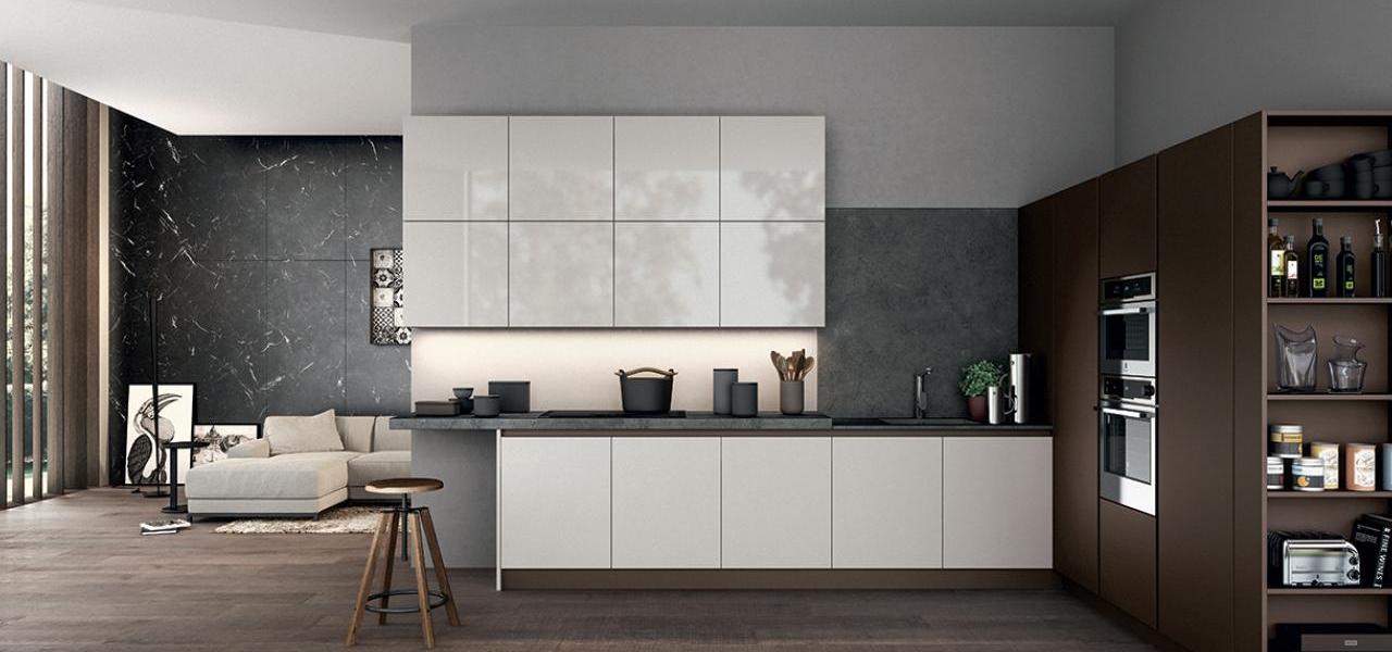 Мебель по дизайну простая и в то же время стильная. Она выполнена в сочетании трех цветов: белого, коричневого и серого. Отличительной характеристикой изделия является отсутствие ручек, что привносит в фасад необычный акцент.