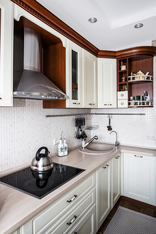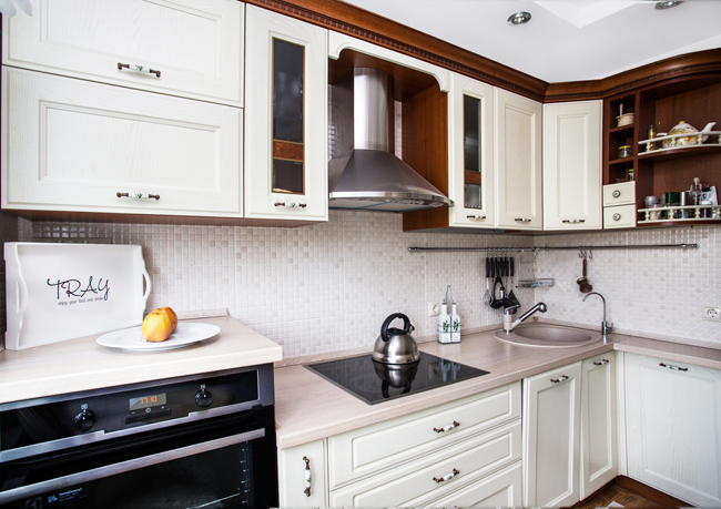 Угловая кухня «Rimini» сочетает в себе контраст фасадов сливочного цвета и темной древесины, из которой изготовлен каркас. Строгие и лаконичные линии придают изящность, а основной изюминкой является декор резными деталями. Гарнитур комплектуется керамическими ручками с рисунком под старину, а цвет столешницы имеет мягкий кофейный оттенок.