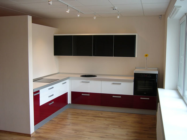 Угловой кухонный набор представлен тремя цветами: черным, белым и бордовым. Модель зрительно разделена на разные рабочие зоны. Верхний модуль представлен четырьмя квадратными ящиками (фасады – черные; каркасы – серые). Нижний модуль поделен на белую и бордовую часть, а также оснащен специальной полкой для микроволновой печи.