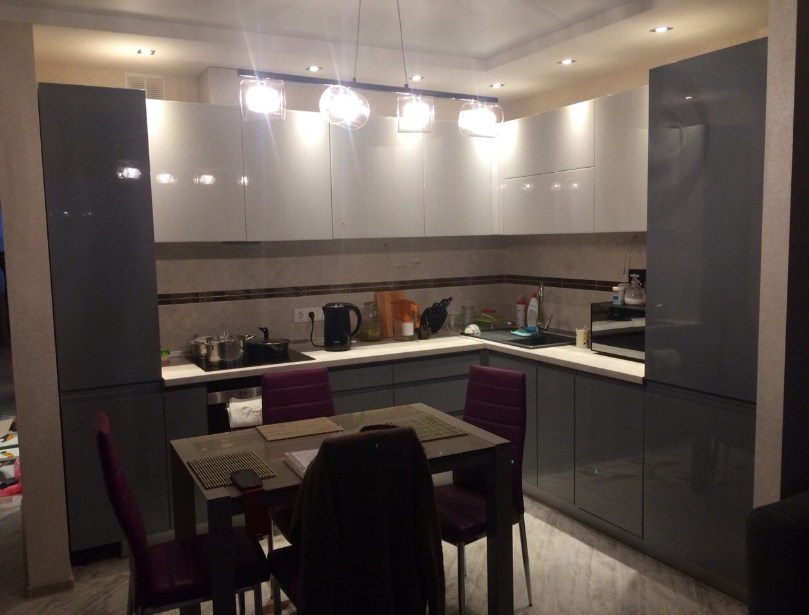 Угловая кухня изготовлена в универсальной расцветке: в сером цвете выполнен низ и боковой пенал со шкафом для встроенного холодильника, верхние навесные модули ламинированы в белый глянец. Фасады без ручек открываются с помощью профильных ручек и от нажатия push-to-open.