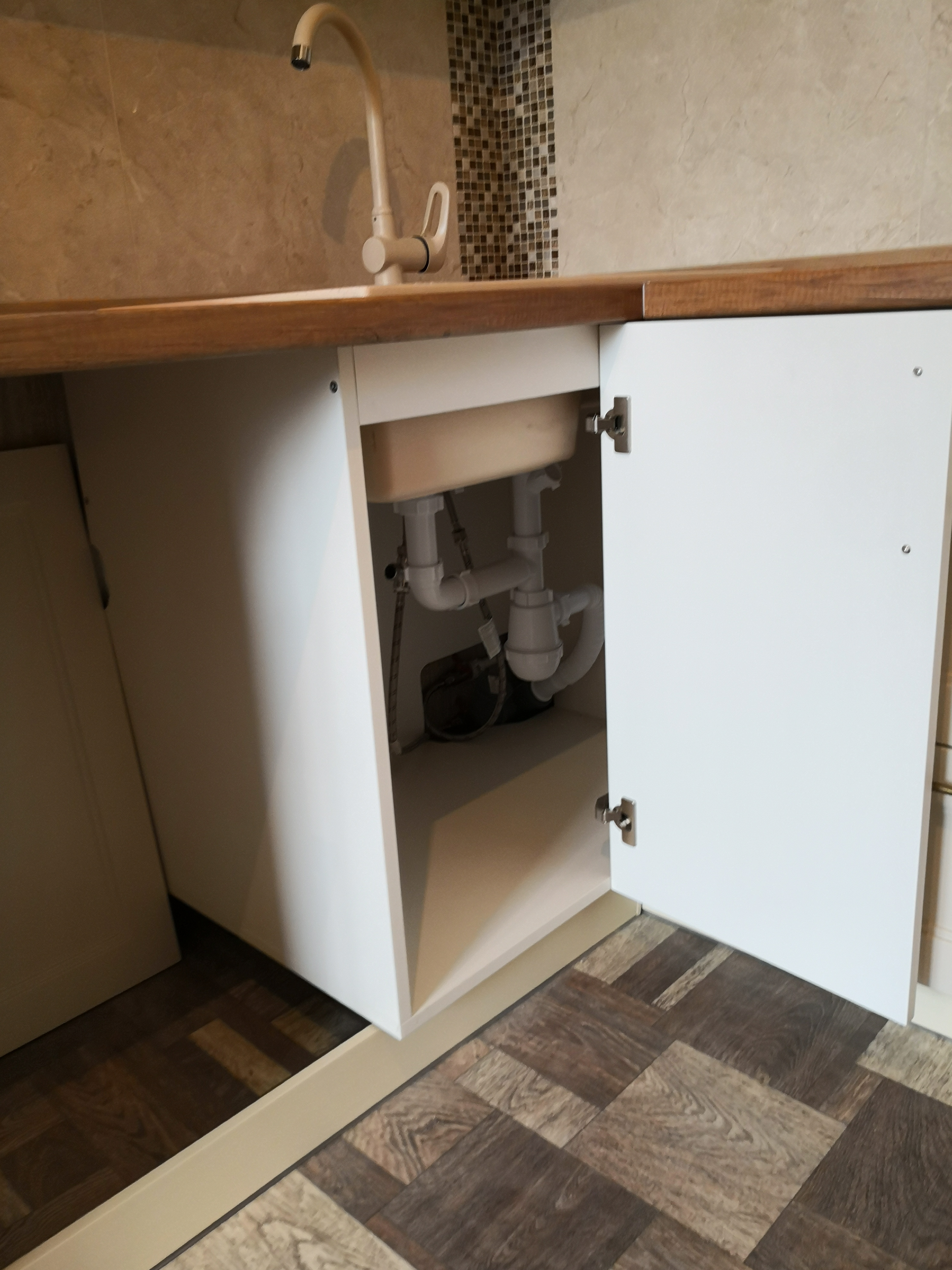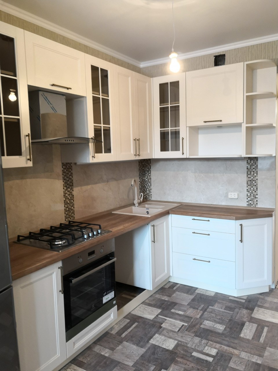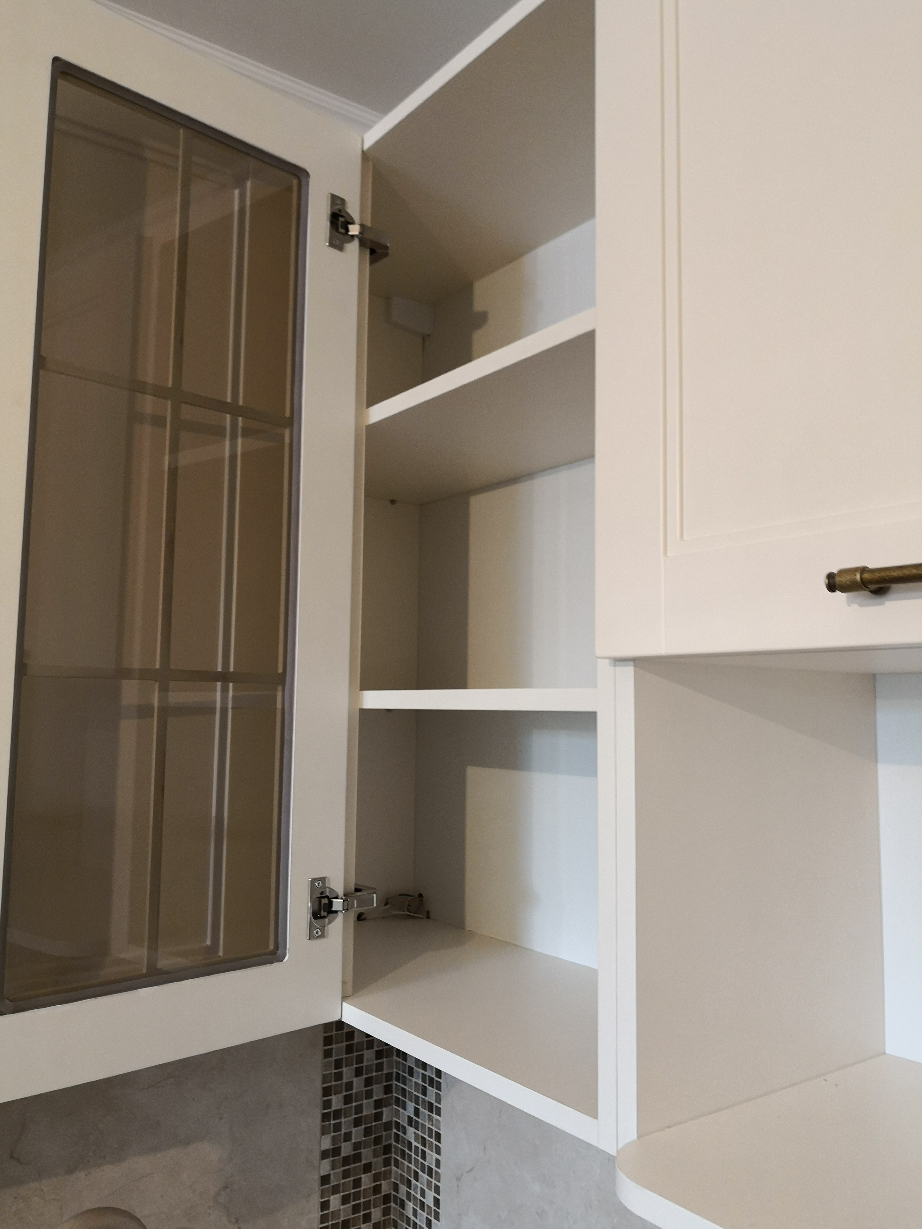 Современный кухонный гарнитур из крашенного МДФ. Вместительные шкафчики.
