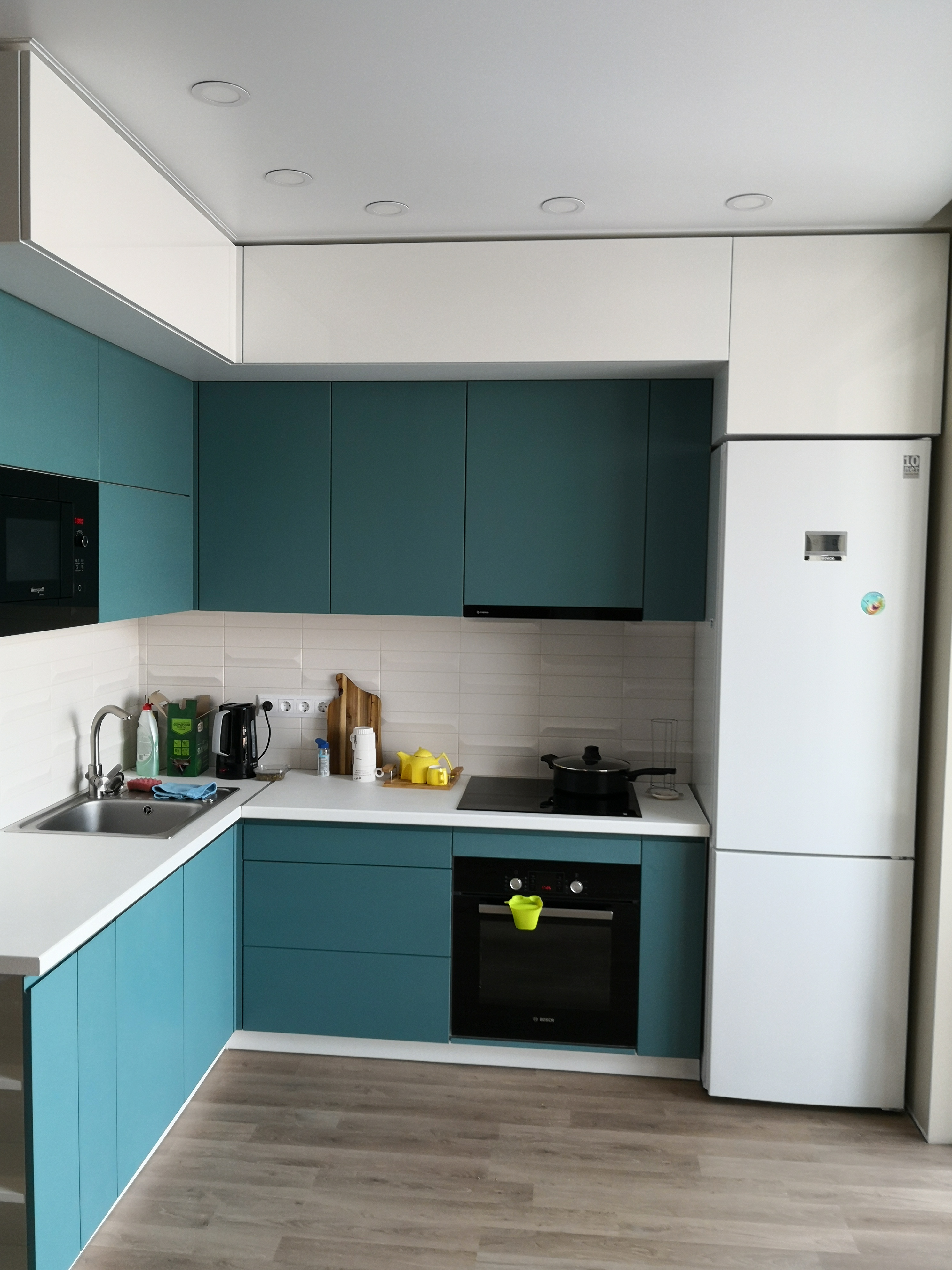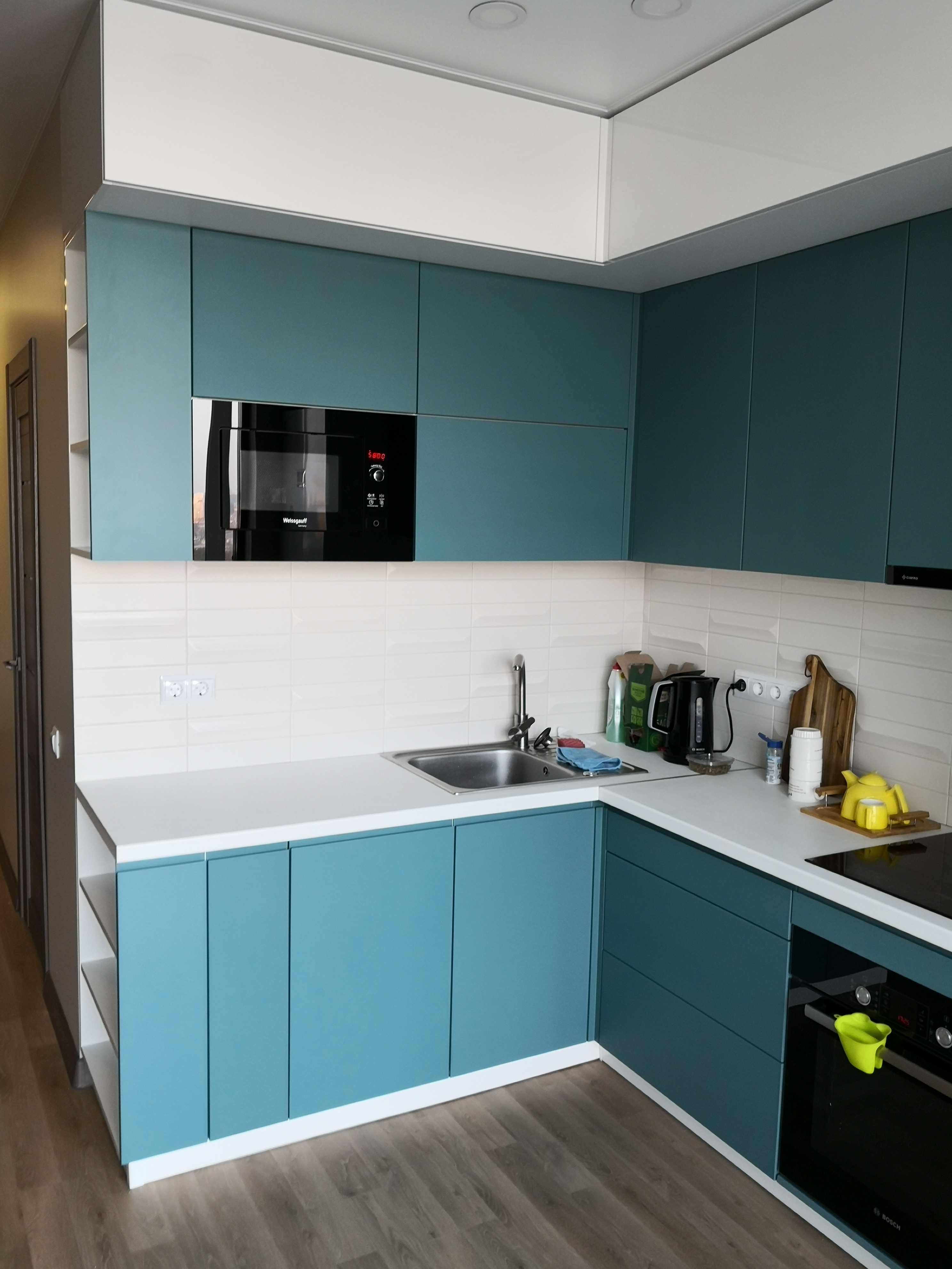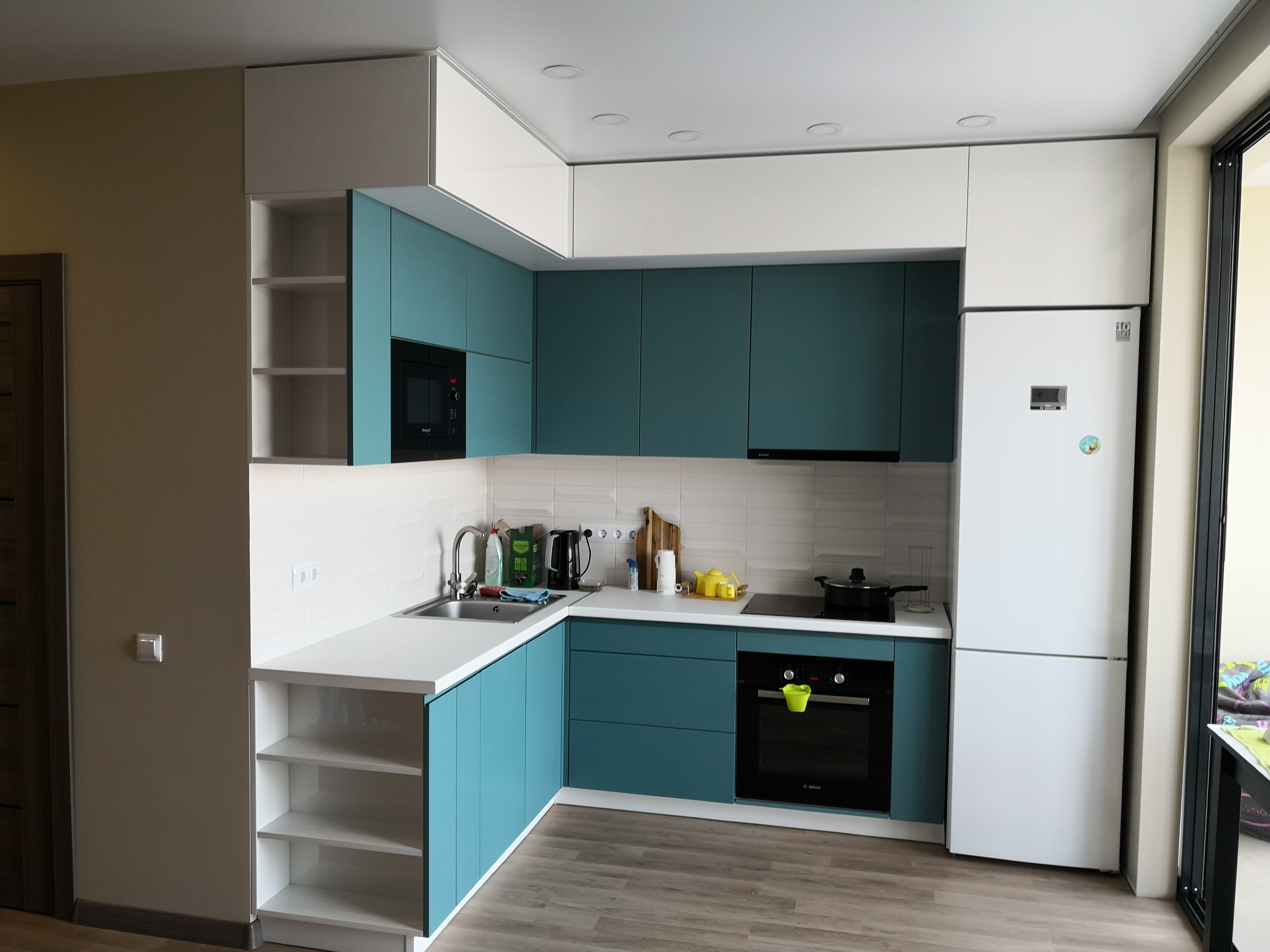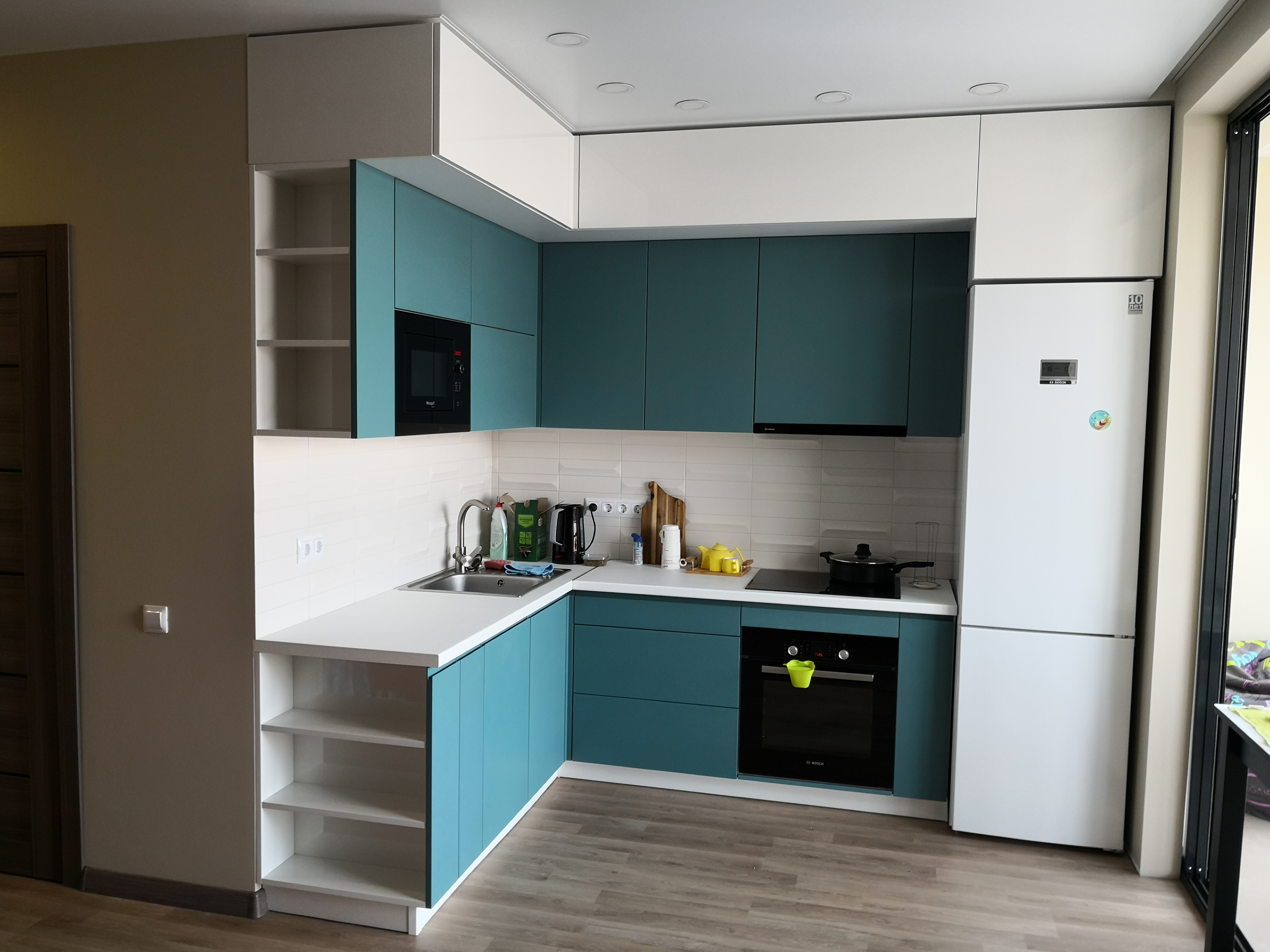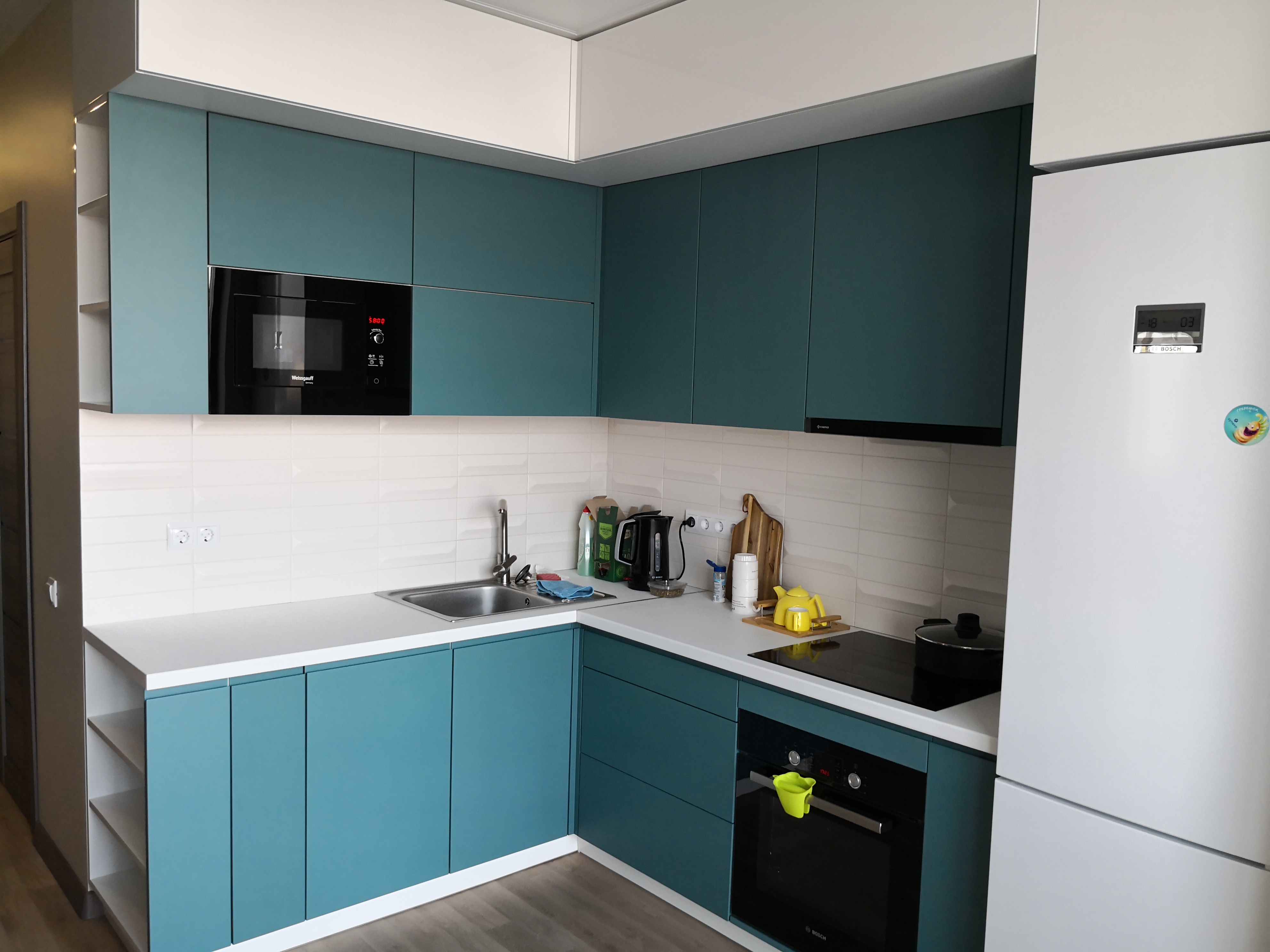 Угловая кухня представлена в оригинальном бирюзовом декоре в комбинации с белыми навесными модулями. Модель оснащена качественными и современными подъемными механизмами, которые помогут быстро и с удобством открывать дверцы. В верхний модуль можно встроить свч-печь и вытяжку. Сбоку расположены несколько крупных открытых полок для специй или кухонных принадлежностей.