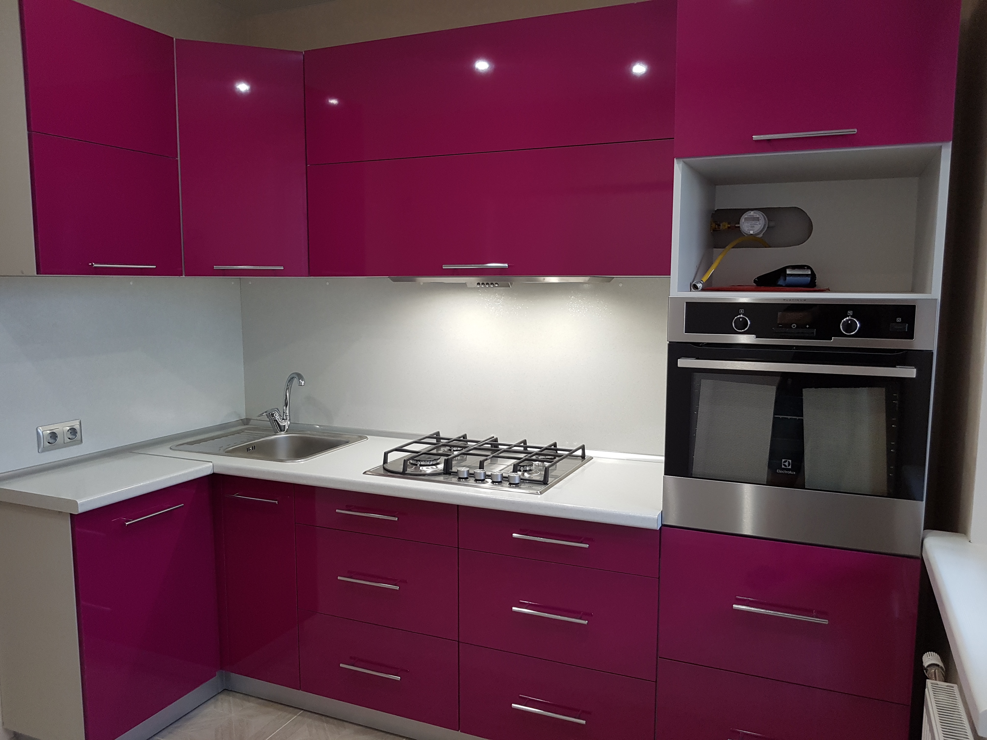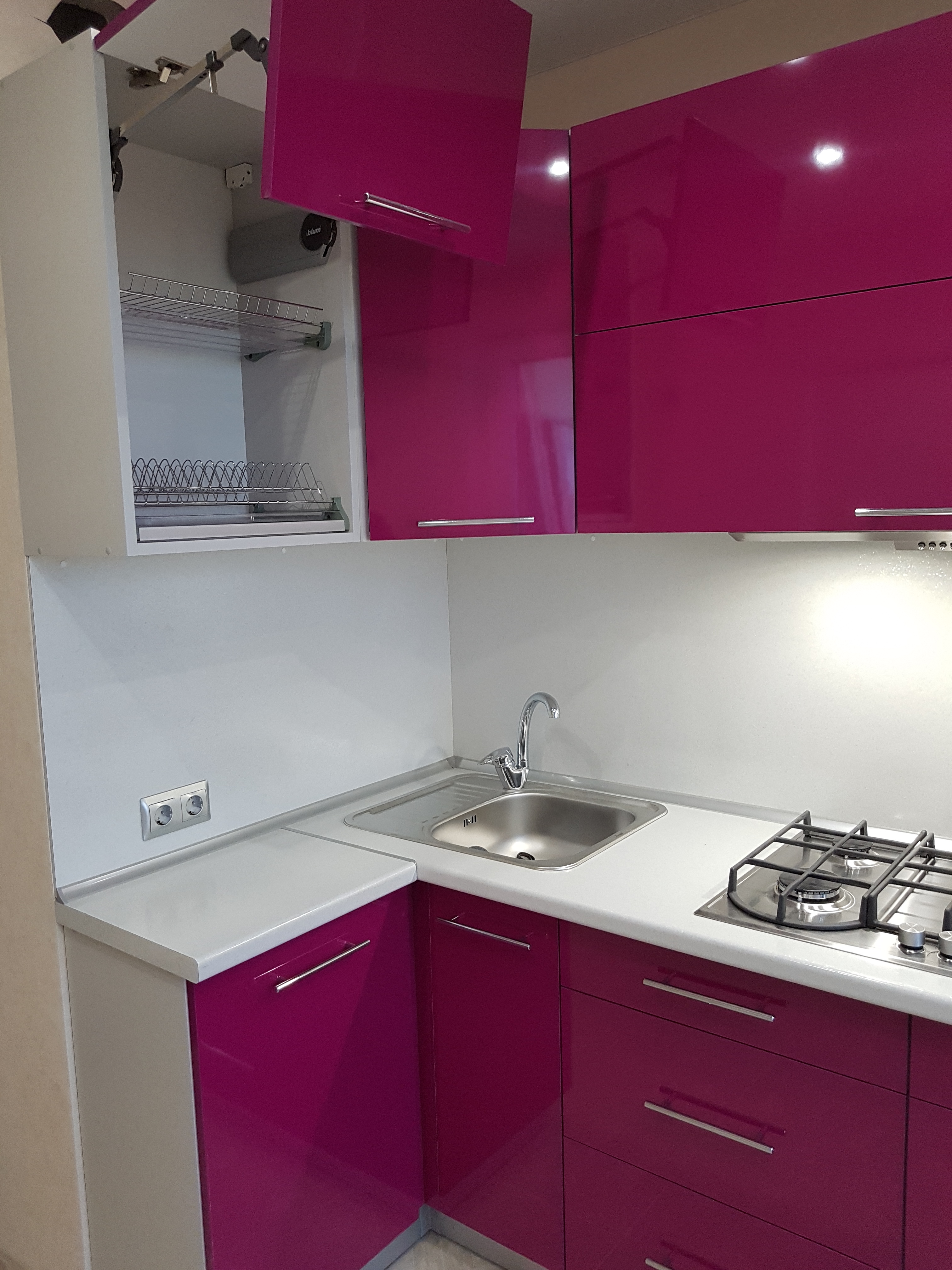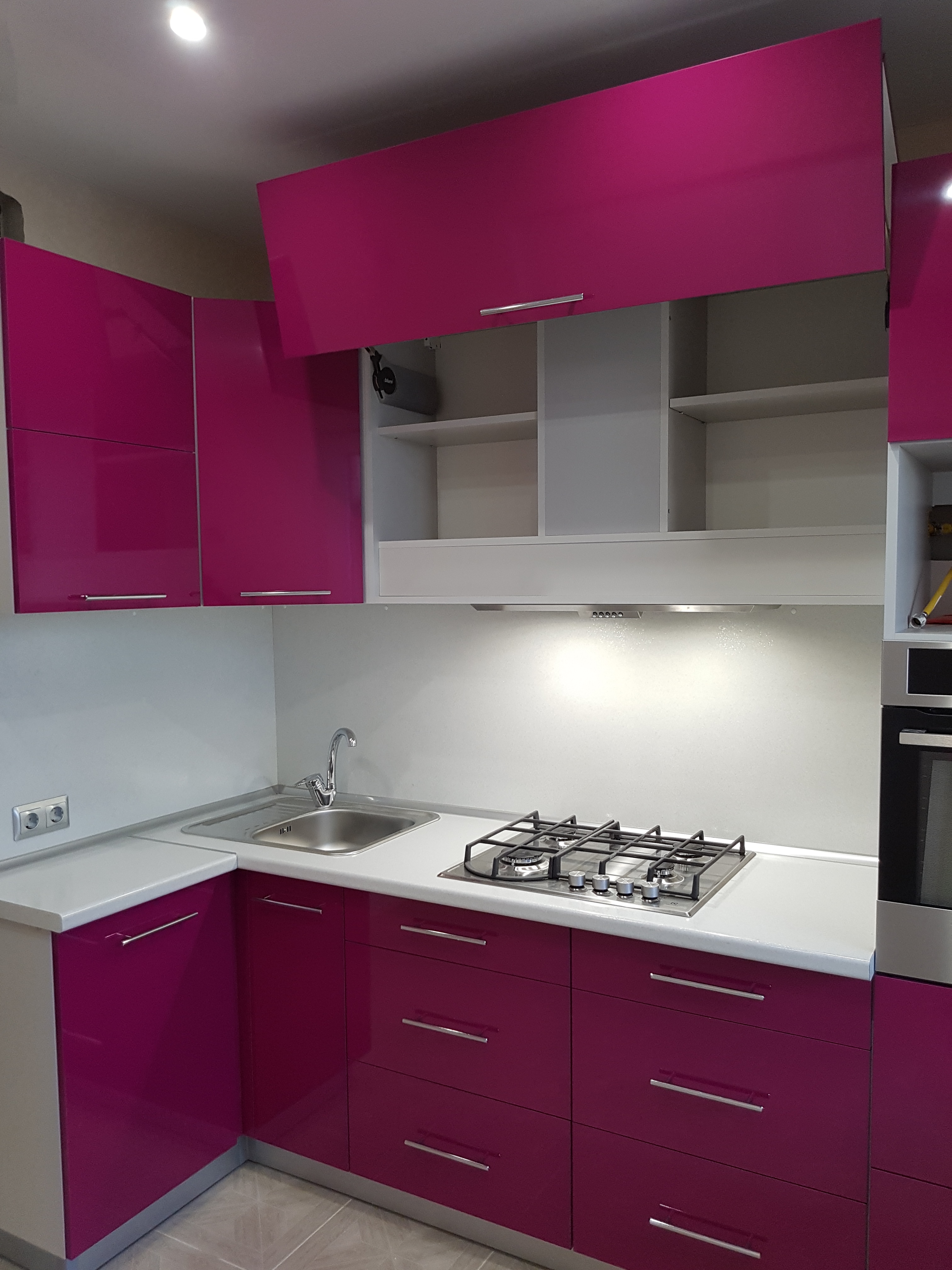 Компактная угловая кухня представлена в насыщенном бордовом цвете, который великолепно смотрится на глянцевых фасадах. Функционал кухни отличается обилием вместительных шкафчиков и выдвижных ящиков. Отличительной особенностью верхних модулей является система подъема дверцы вверх, что является весьма удобной опцией при ограниченном пространстве кухни.