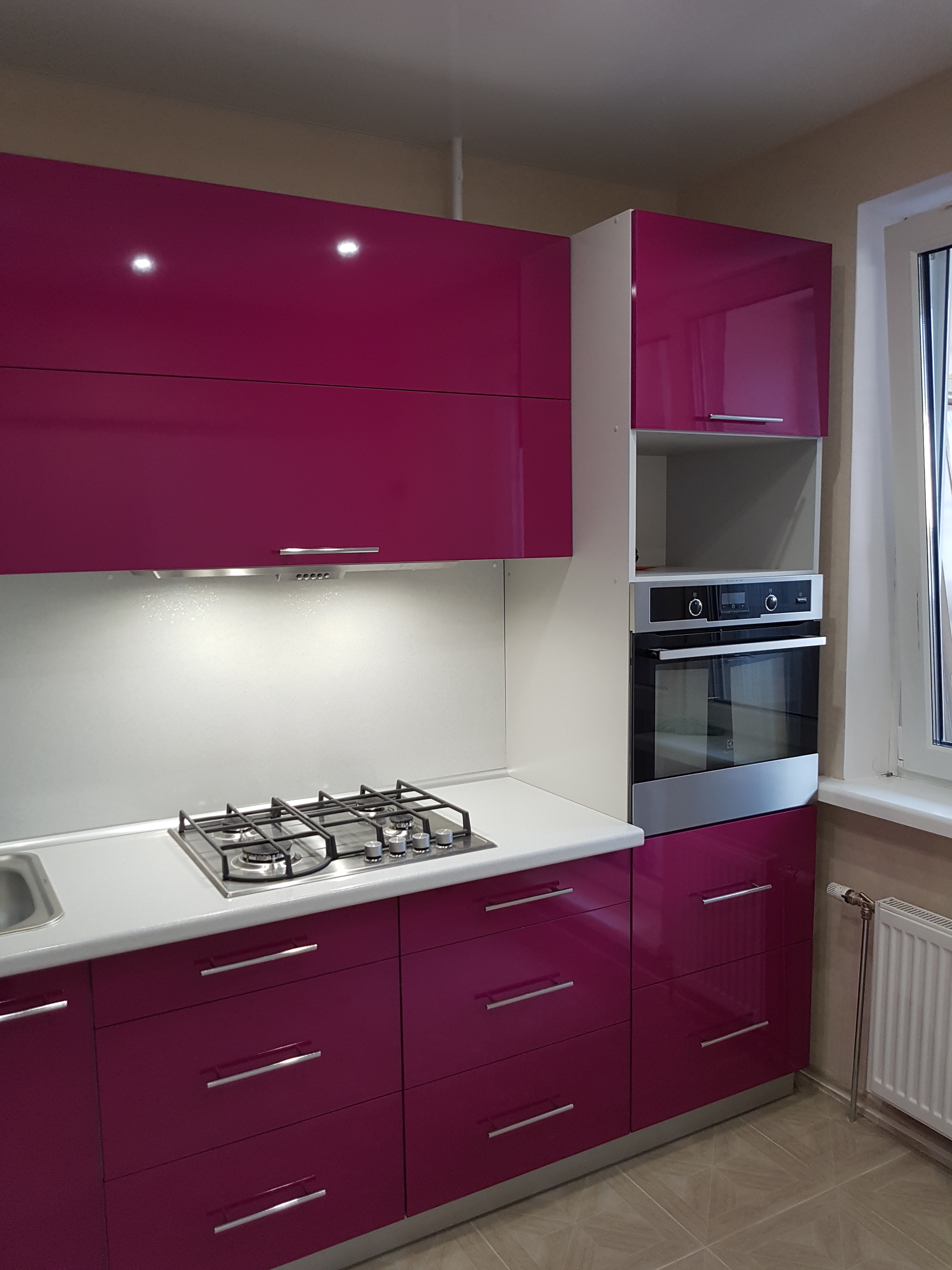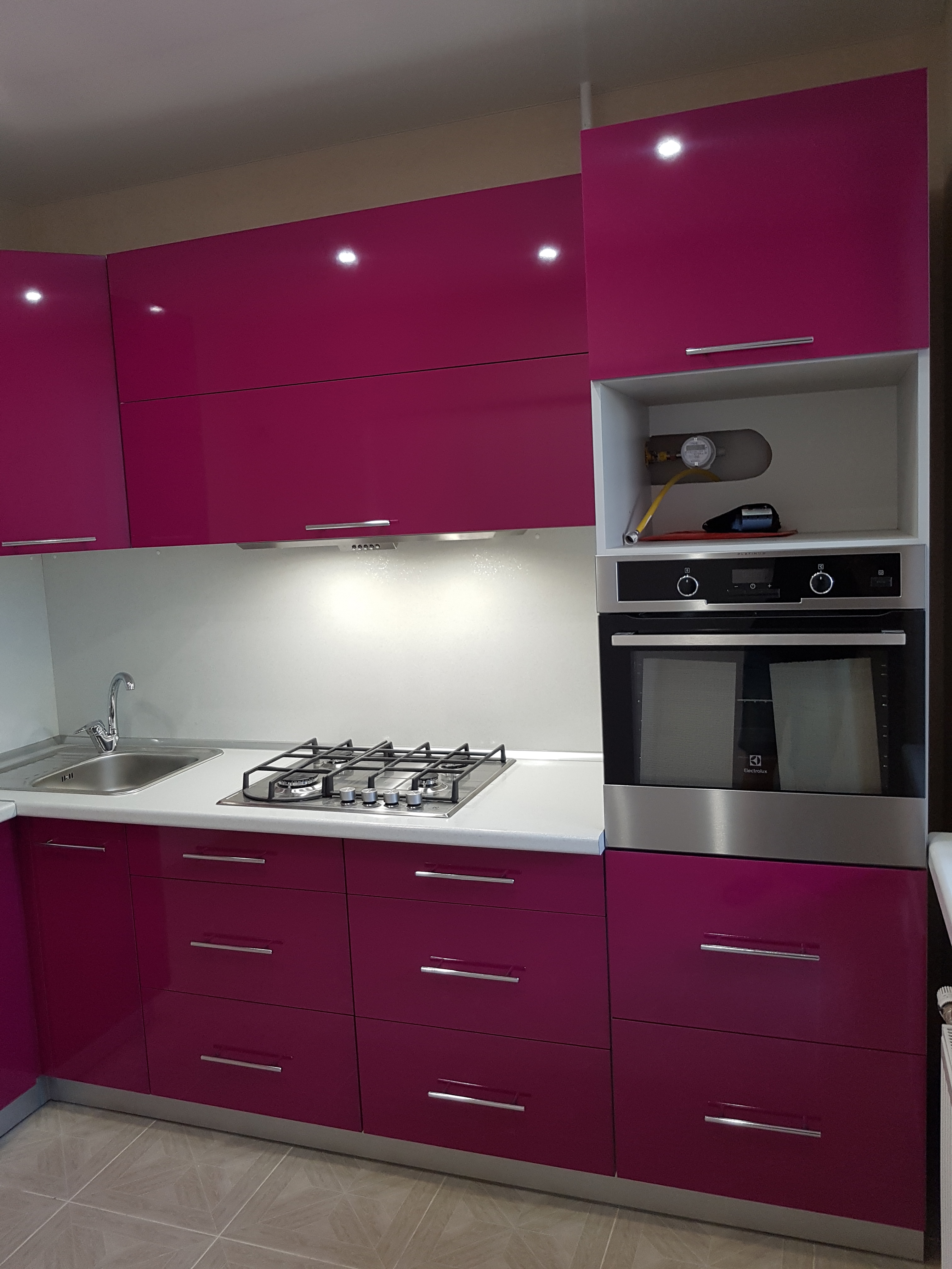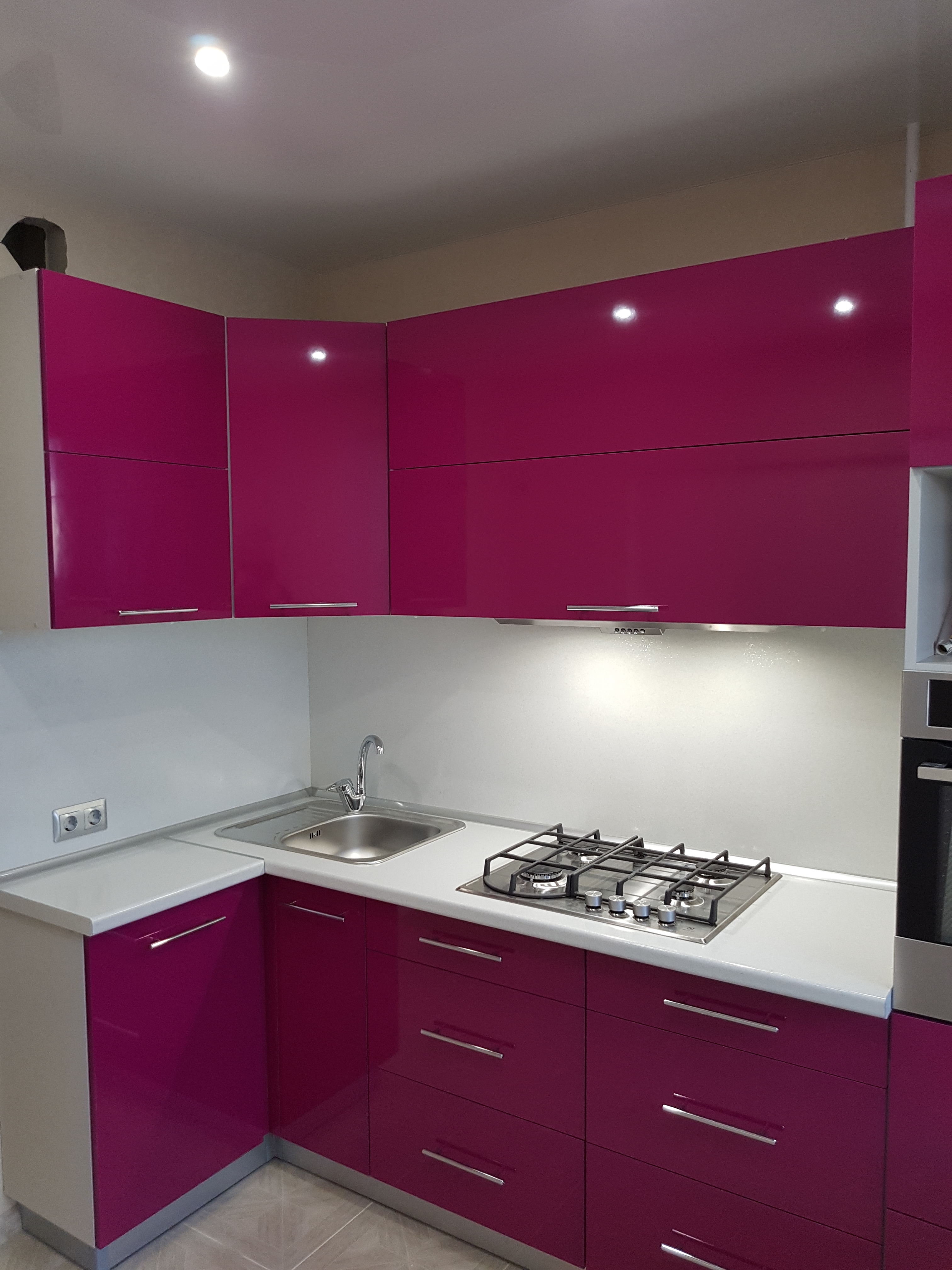 Компактная угловая кухня представлена в насыщенном бордовом цвете, который великолепно смотрится на глянцевых фасадах. Функционал кухни отличается обилием вместительных шкафчиков и выдвижных ящиков. Отличительной особенностью верхних модулей является система подъема дверцы вверх, что является весьма удобной опцией при ограниченном пространстве кухни.