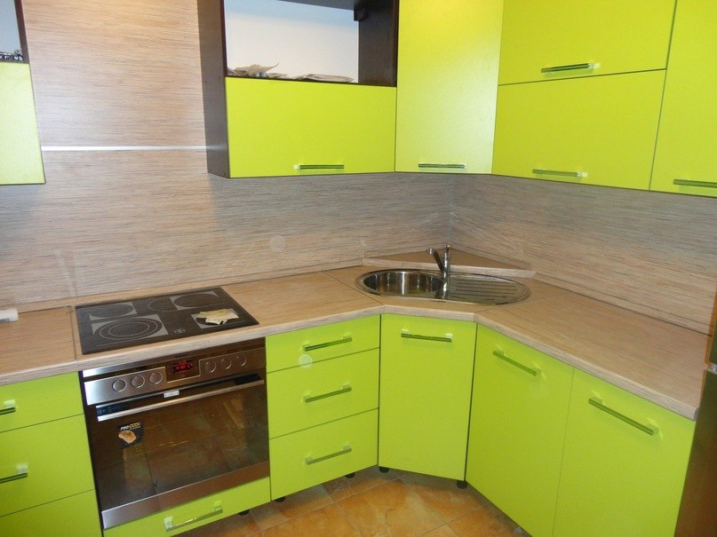 Современная кухня с широким ассортиментом материалов и цветов оформления.