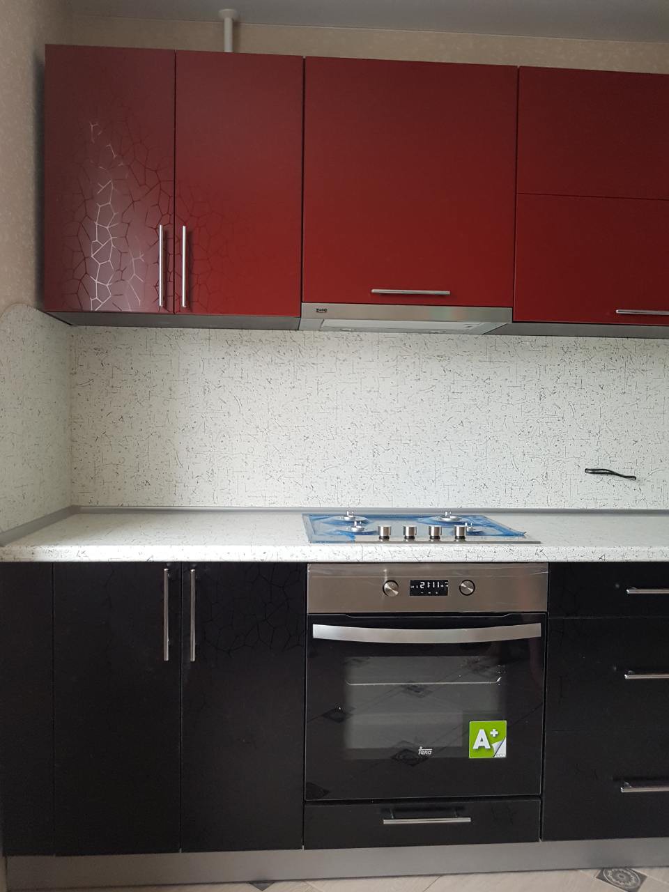 Линейная кухня из пластика выполнена в двух контрастных цветах - черный и белый. Белая столешница имитирует текстуру натурального камня. Фасады навесных и напольных шкафов украшены рисунком. Широкие металлические ручки позволяют удобно открывать полки. Обширное рабочее пространство позволит эффективно сэкономить время при приготовлении пищи. Бытовая техника со стальной отделкой станет отличным дополнением для данного гарнитура.