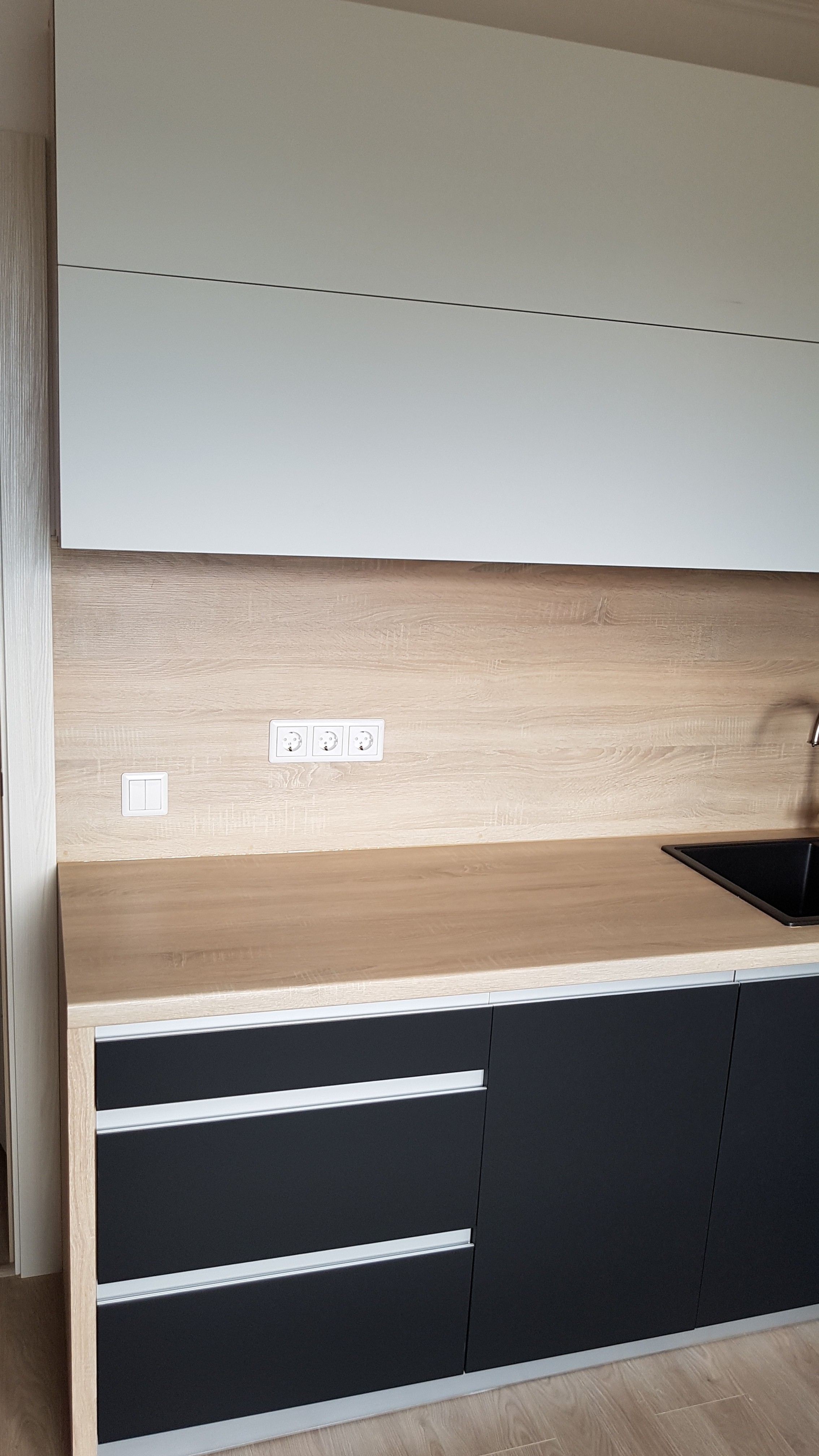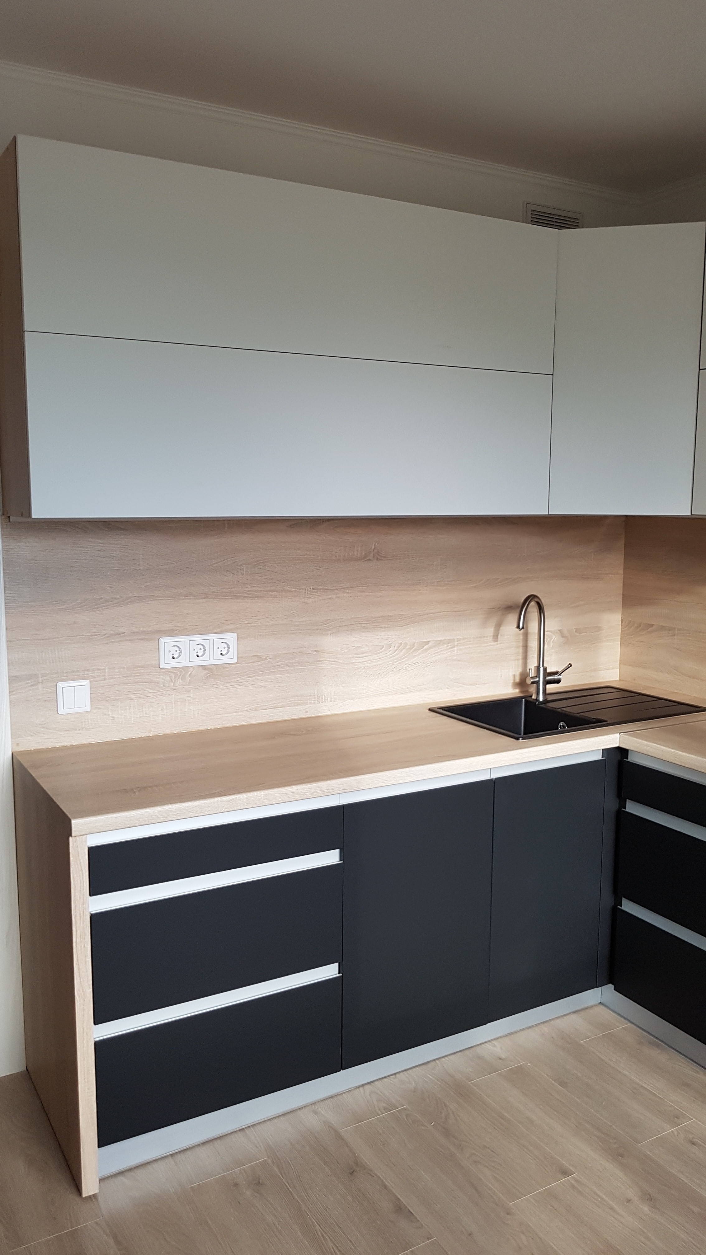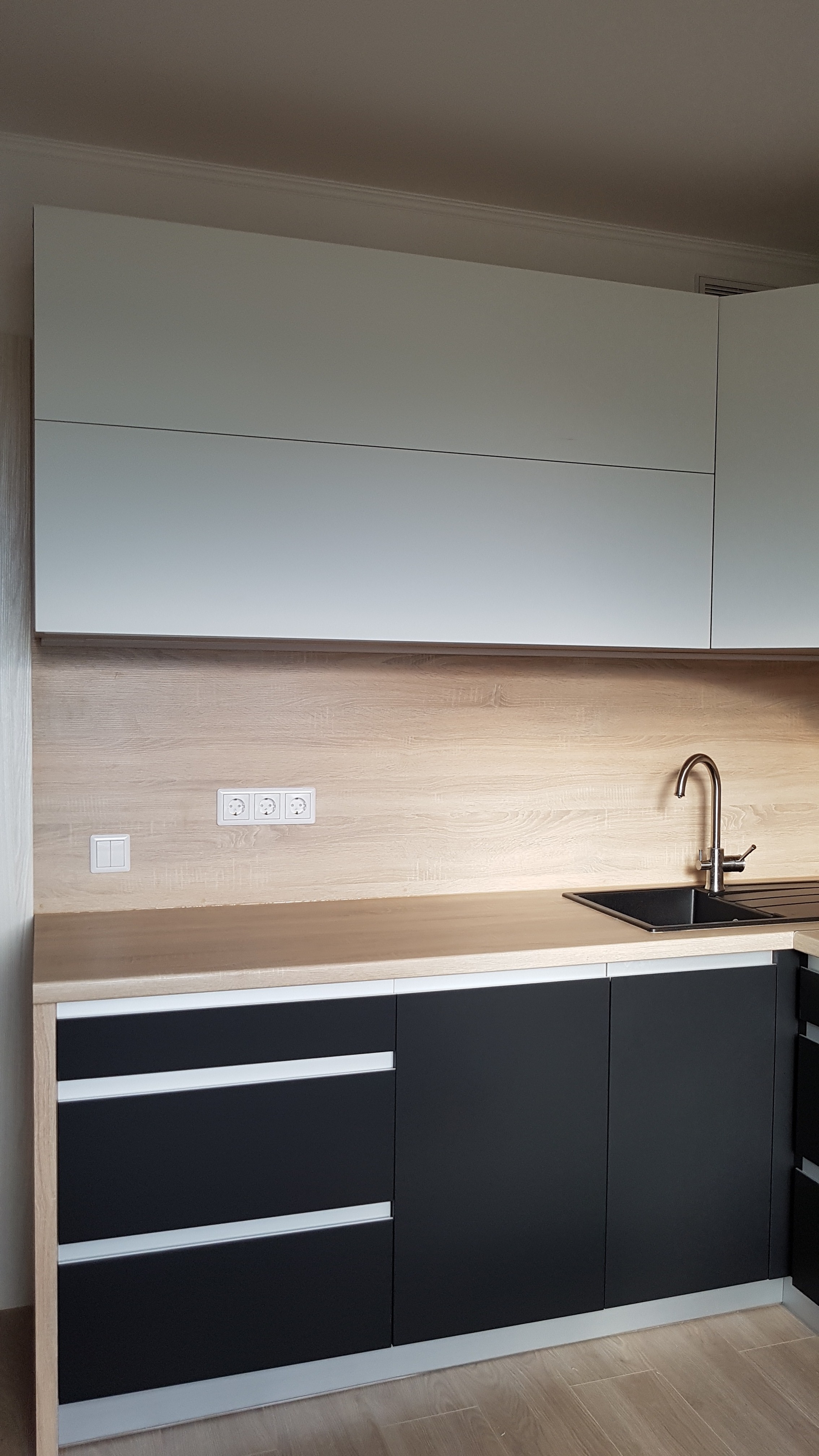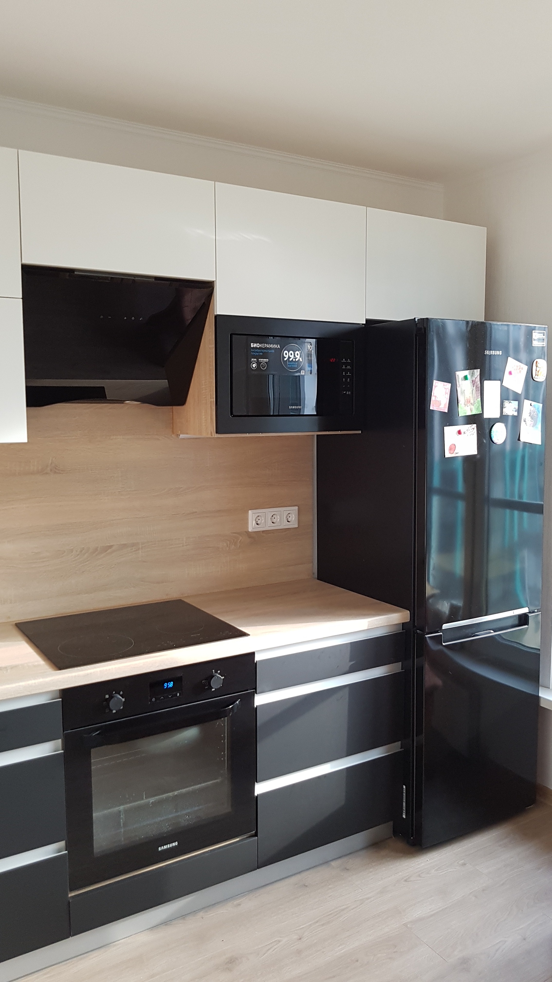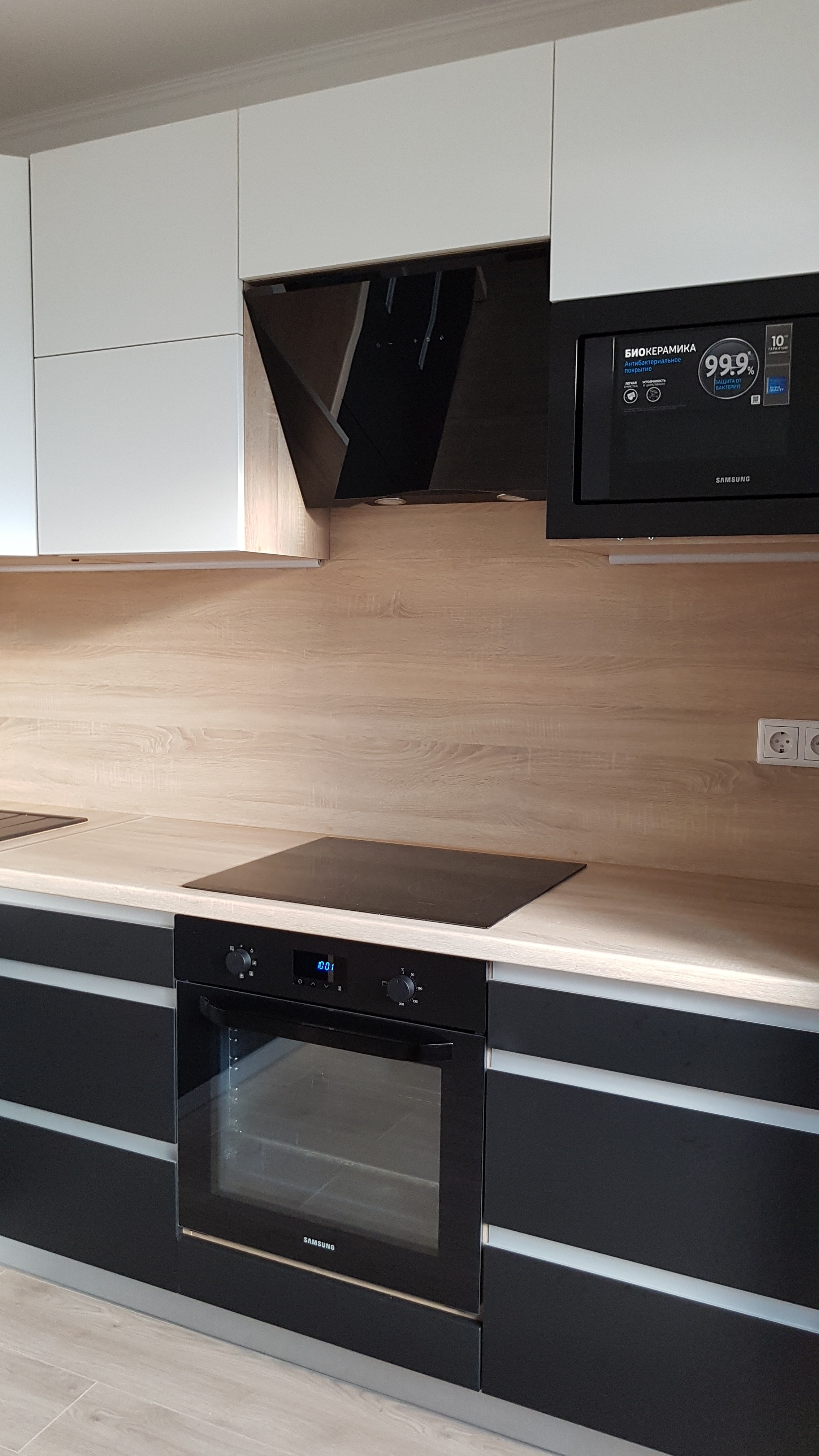 Стильный черно-белый гарнитур идеально подходит для современного интерьера. Кухня изготавливается из прочного ДСП. Матовые серые фасады прямые, распашного и выдвижного типов. Рейлинговые встроенные ручки выполнены из хрома. Коричневая столешница из массива.