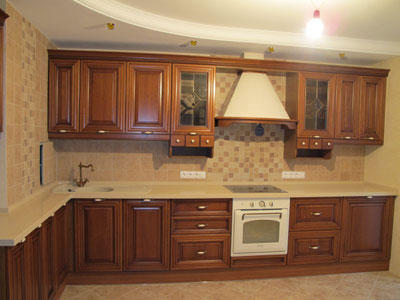 Классическая угловая кухня представлена в расцветке «Яблоня». Фасады декорированы резными элементами. Данная модель оборудована множеством шкафов и выдвижных ящиков, где можно легко разместить всю необходимую посуду.