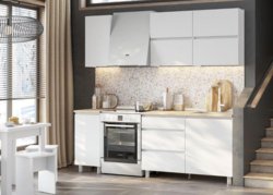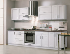 Белая прямая кухня с верхними шкафами