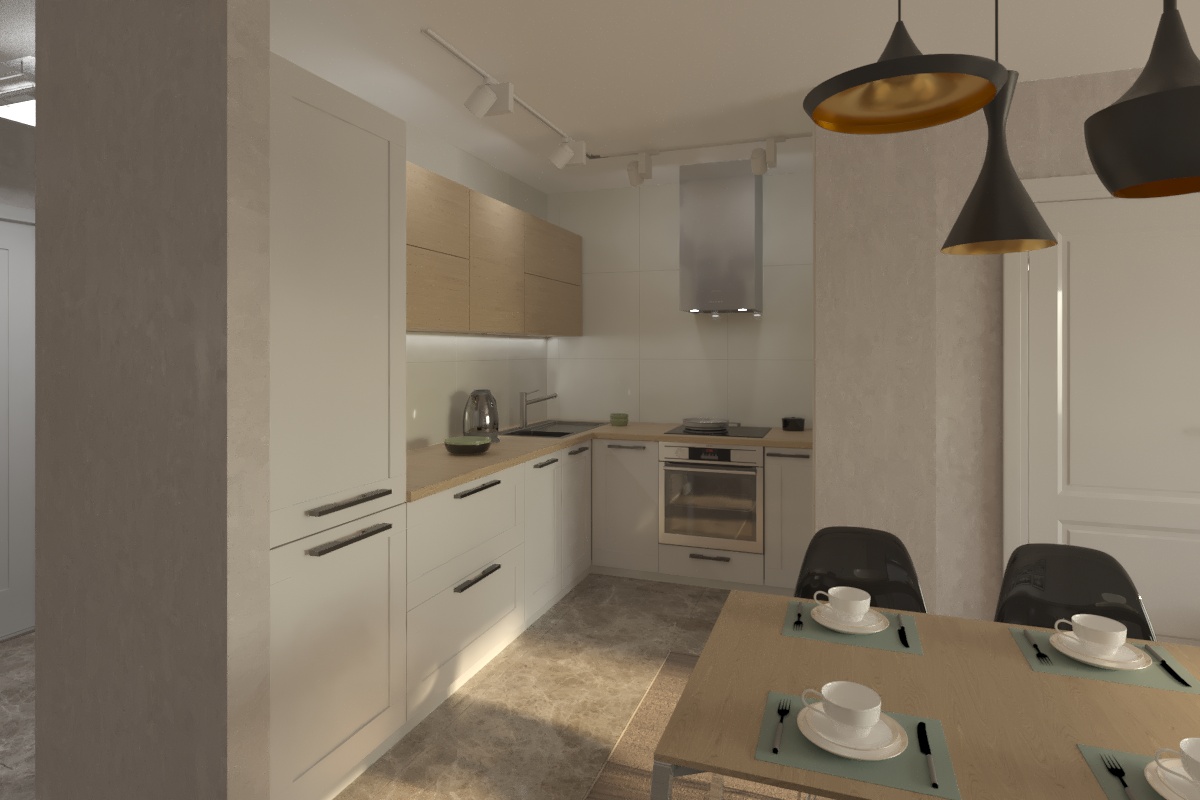 Интегрированные ручки, ниши для техники, нежное сочетание оттенков.
