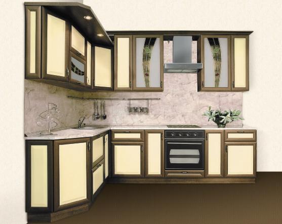 Витражные вставки в навесных шкафах. Открытые радиусные полки.