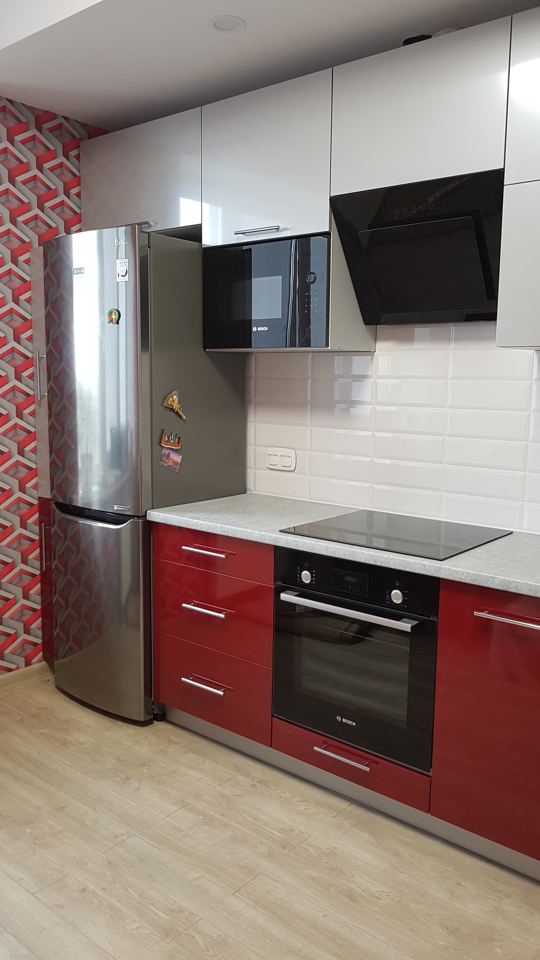 Глянцевые фасады угловой кухни представлены в комбинации красного и белого цветов. Кухня отличается тщательной проработкой геометрии и визуальной простотой. Практичная угловая столешница позволит раскрывать весь ваш кулинарный потенциал. Фурнитура представлена стильными металлическими ручками.