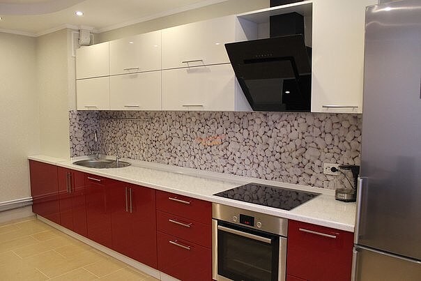 Модель кухни довольно довольно светлая по своей цветовой гамме и общему восприятию несмотря на наличие темно-кирпичного цвета в нижнем модуле. Фасад кухни выполнен в современном стиле и декорирован прямыми, хромированными ручками. Для создания большего контраста и яркости фартук выполнен с фотопечатью «камни».