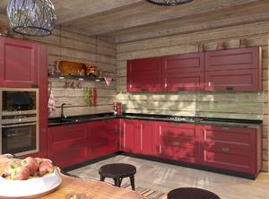 Кухня в матовом красном цвете акцентирует внимание и характеризует хороший вкус обладателя. Угловая модель довольно крупная по габаритам.