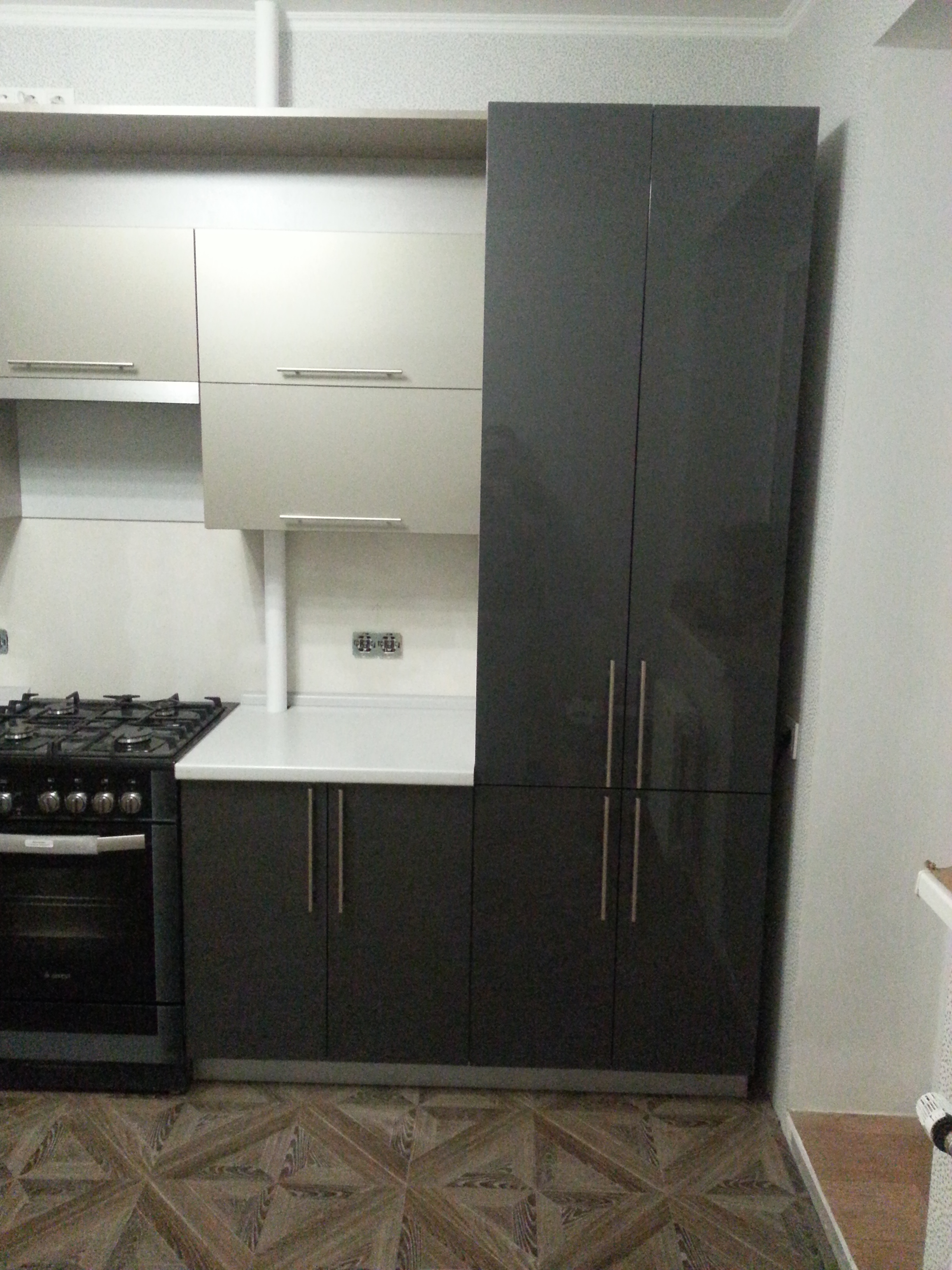Длина кухни: 3.4х1.4 м. Материал фасада: пластик.