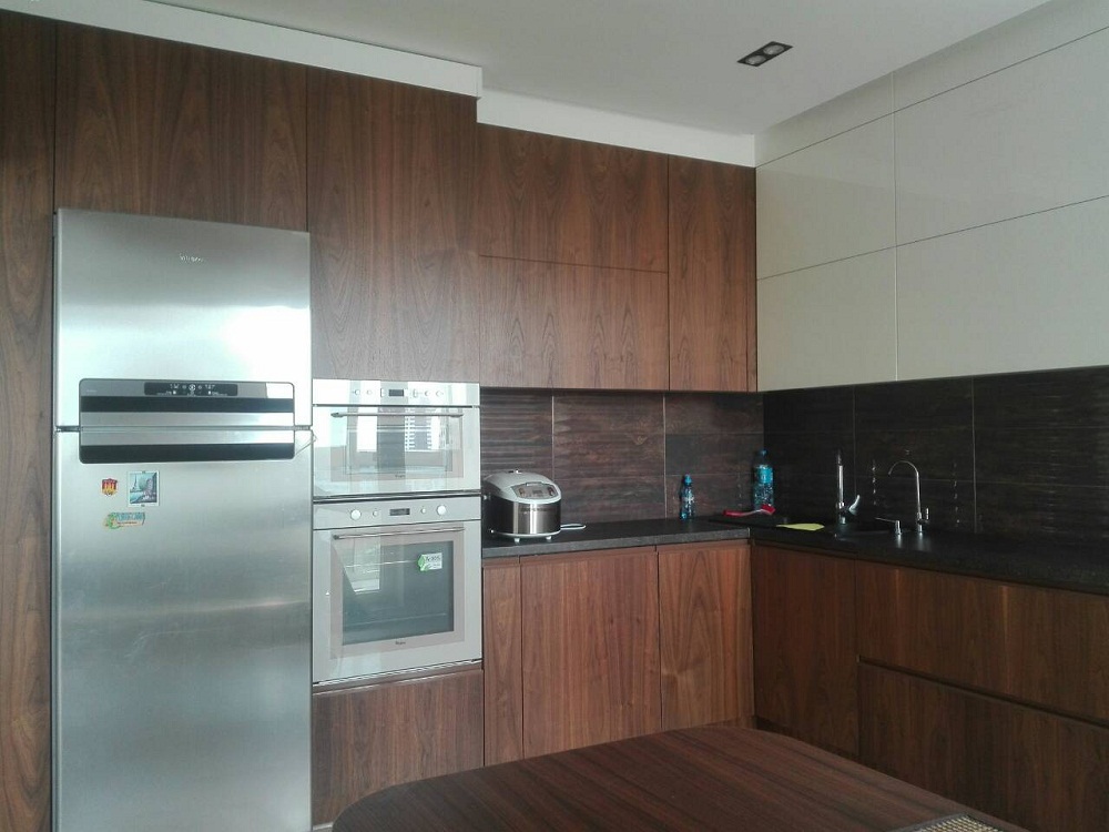 код 91765Фасады без ручек под темный орех с модулем в белом глянце. Скандинавский стиль.