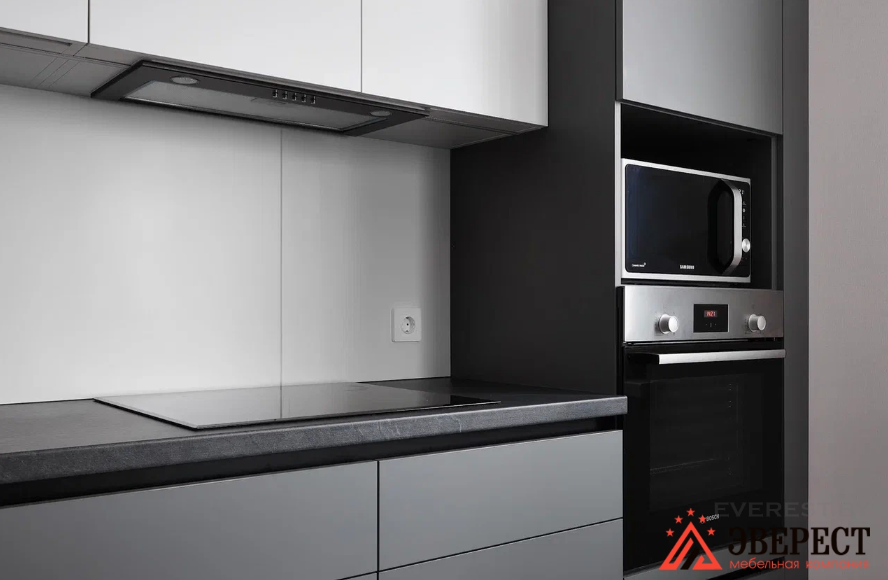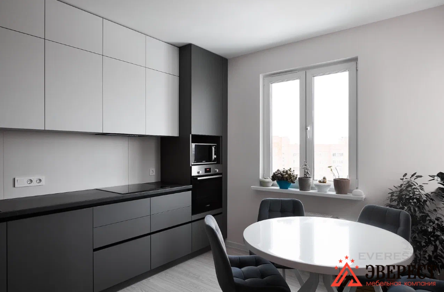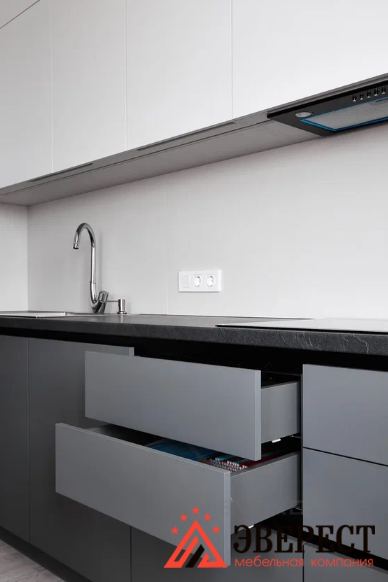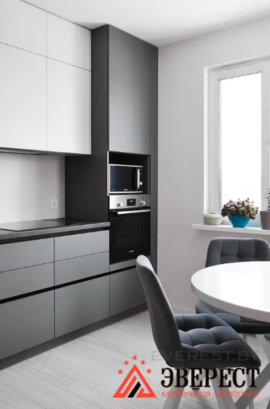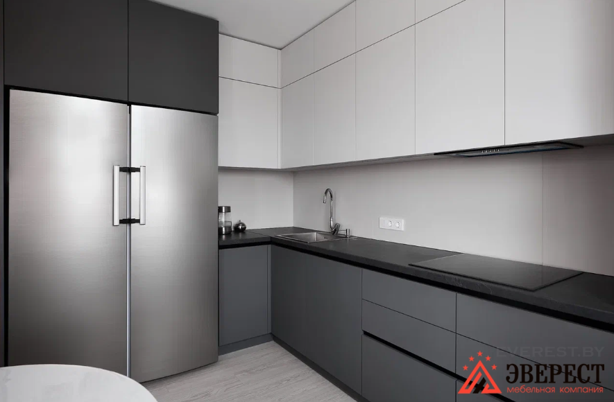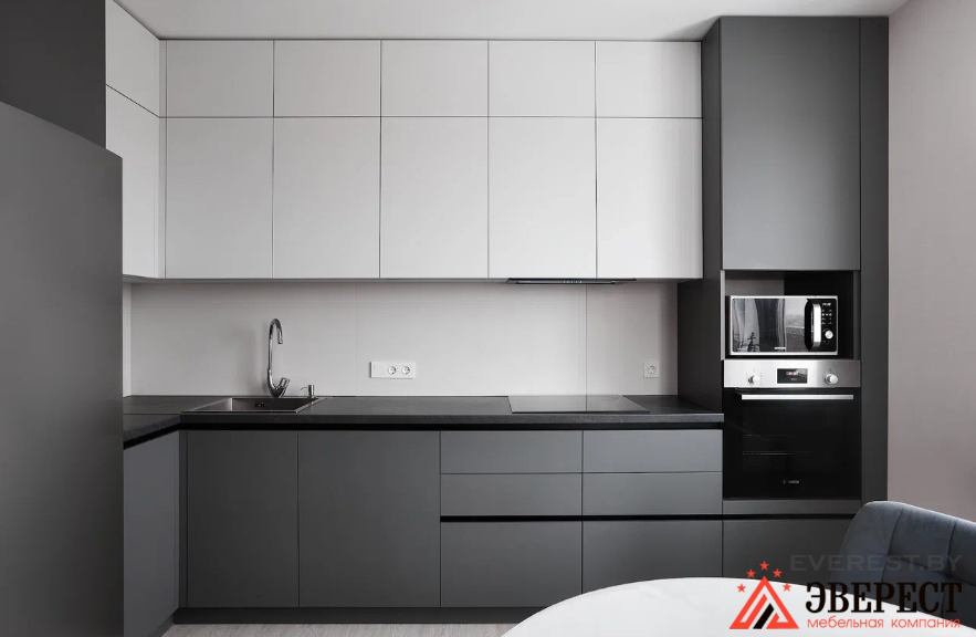 Угловая кухня в матовом исполнении без ручек. Фасады верх AGT 3018 белый супермат Низ AGT 3024 супермат серый оникс. Ручки Gola профиль черного цвета. Фурнитура Blum. Фрезеровка нижней части навесных шкафов для установки подсветки над рабочей зоной.