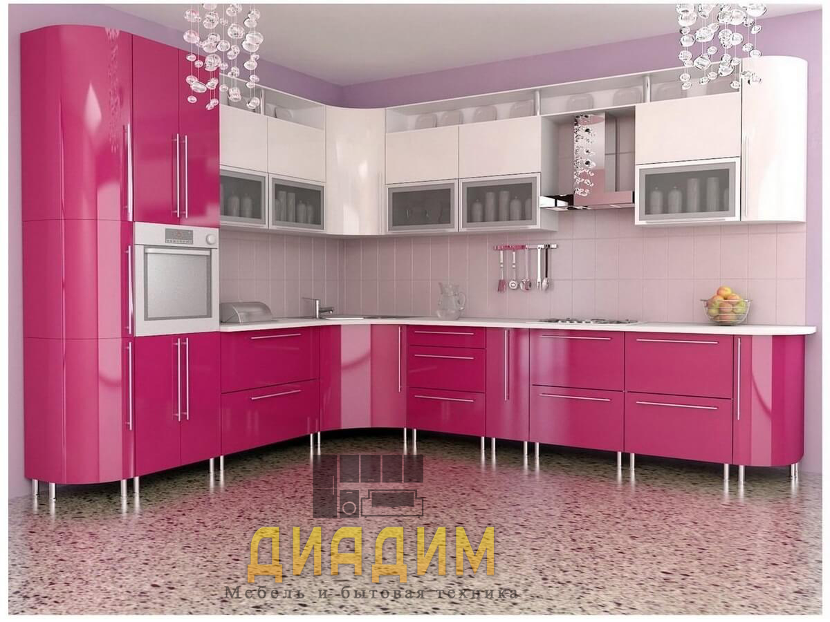 Пестрые розовые фасады добавят позитива атмосфере помещения. Угловая конструкция выполнена в комбинированном цвете: розовом и белом. Металлическая фурнитура отлично дополняет общий вид. Кухня представлена в радиусной форме. Поверхность имеет мягкие глянцевые переливы.
