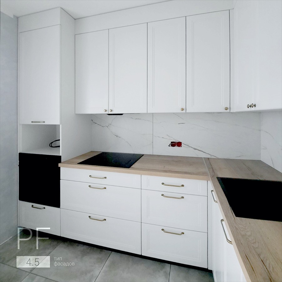 Угловая белая кухня с древесной столешницей
