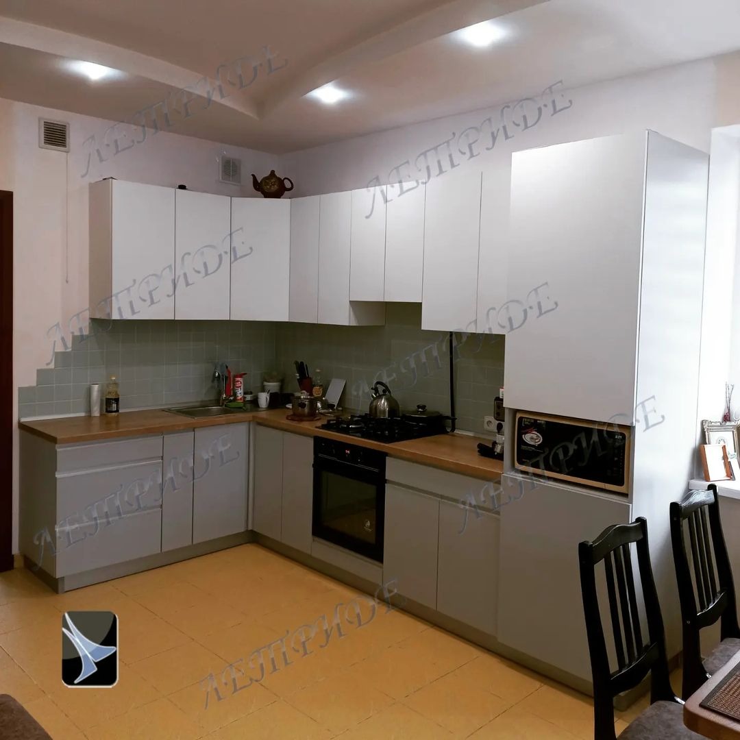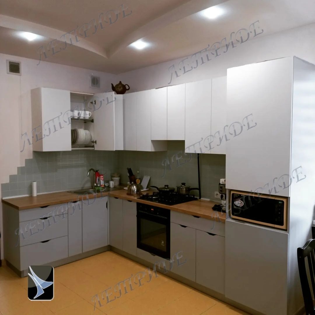 Темные и светлые фасады из пленочной МДФ. Ширина кухни 220 см.