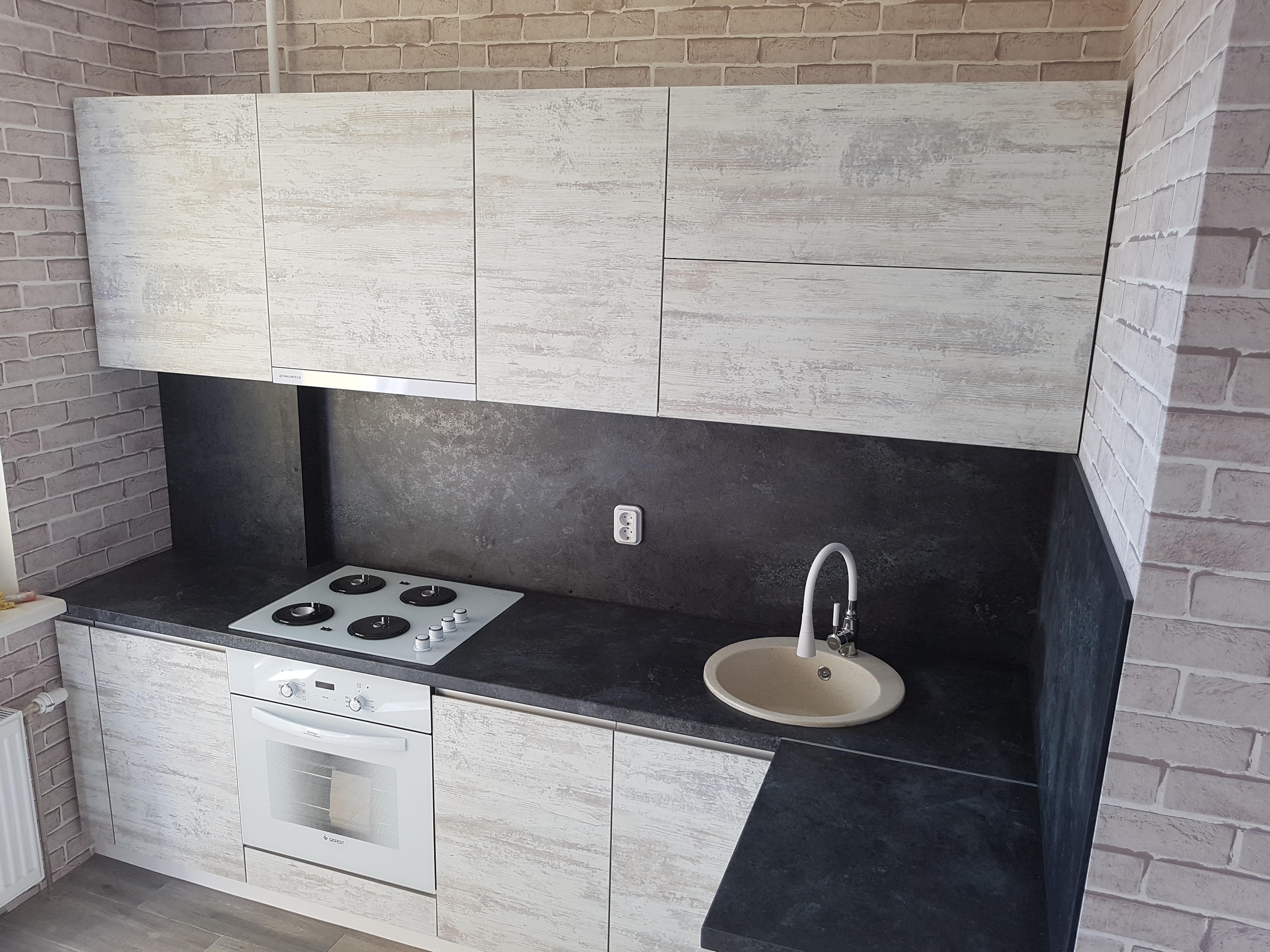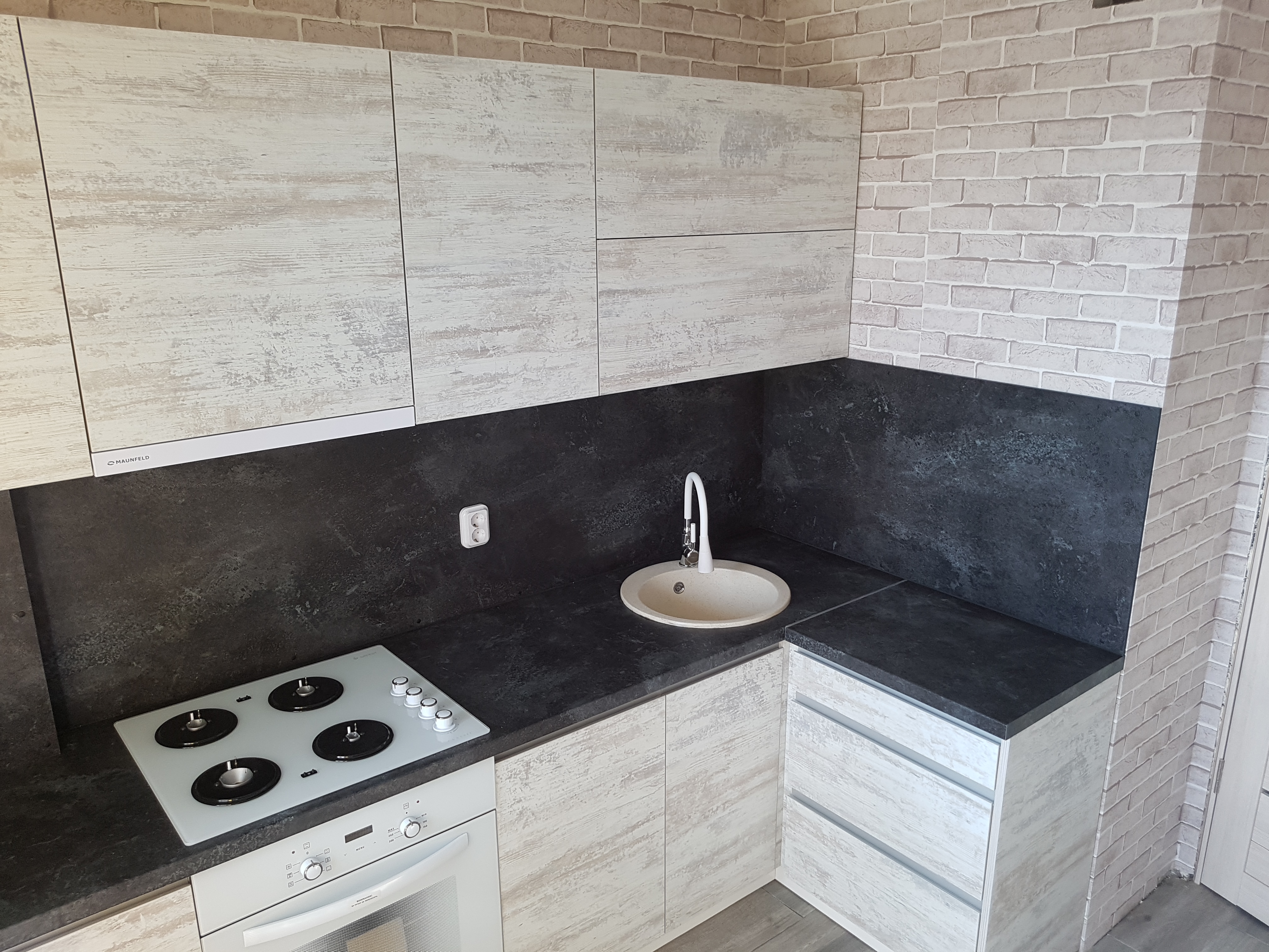 код 109587Фасады без ручек. Столешница и фартук в едином стиле. Удобное рабочее пространство.