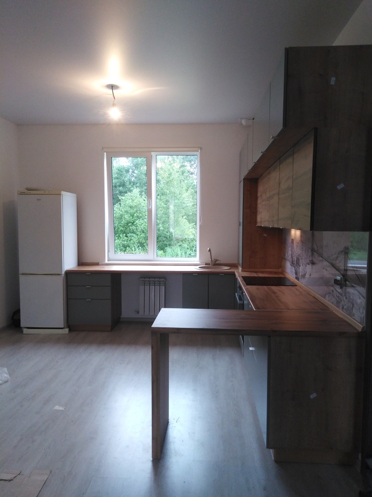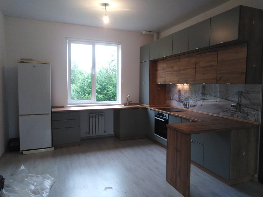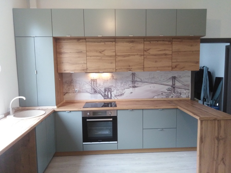 Кухня угловая под светлый интерьер. Покрытие из ЛДСП с имитацией дерева.