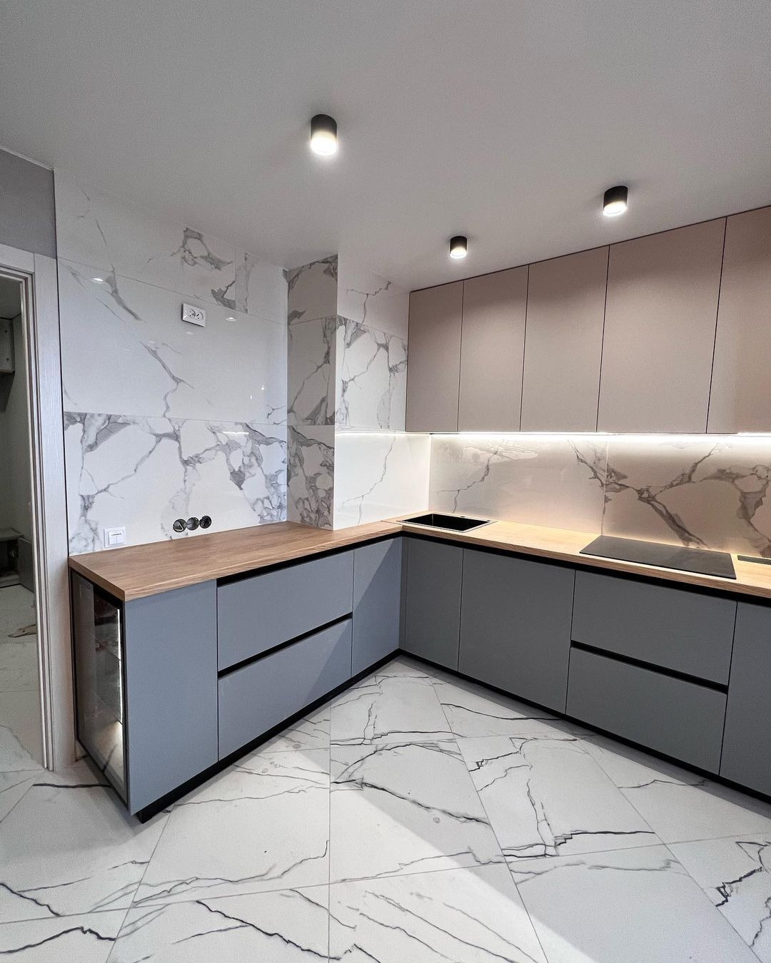 Минималистичные матовые фасады в белом цвете без ручек.