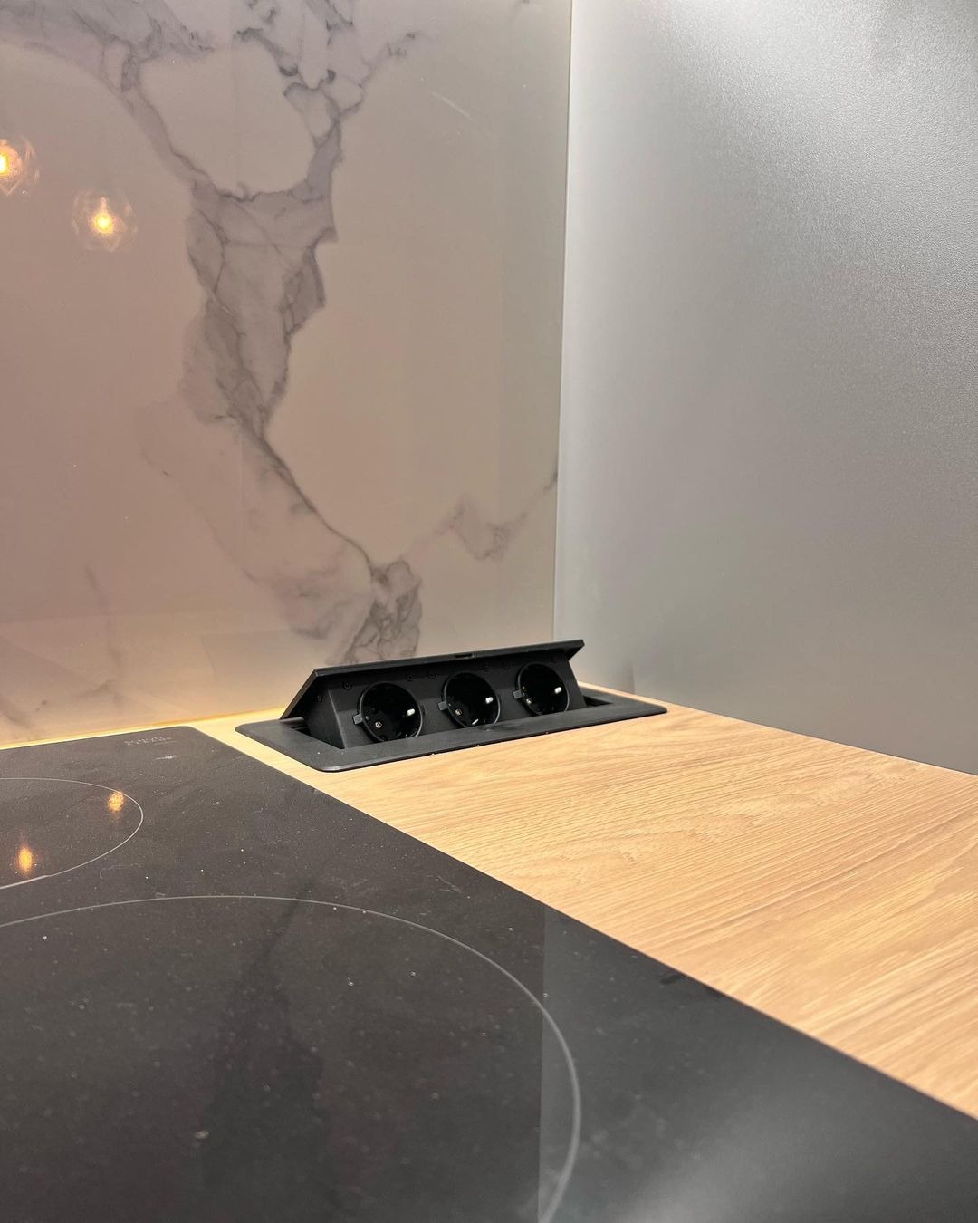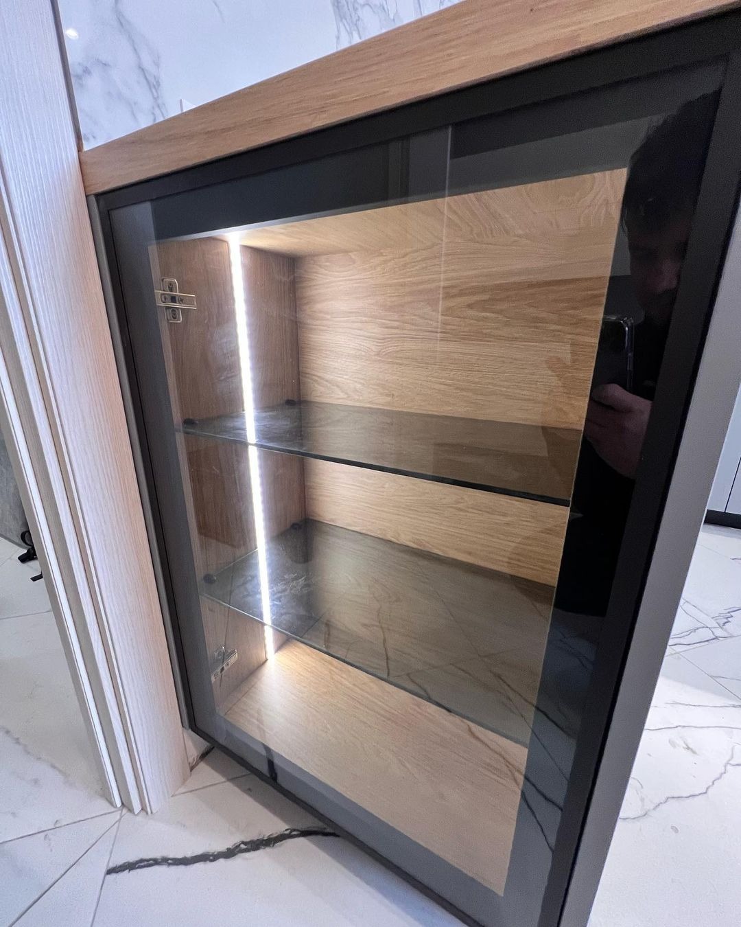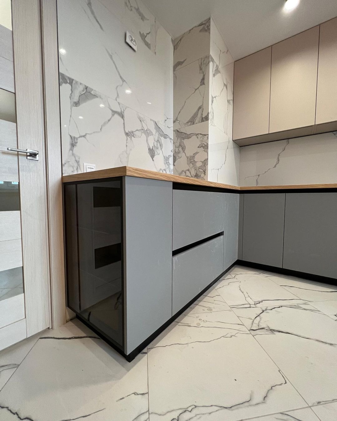 Светлая глянцевая поверхность, цельная многоуровневая столешница.