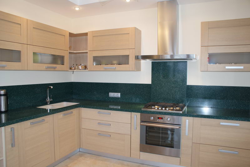 код 89244Столешница под зеленый камень. Фасады в филенках и легком остеклении.