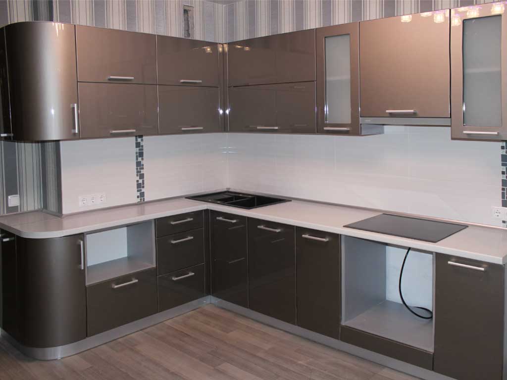 Лаконичная угловая кухня исполнена в цвете металлик на глянцевых фасадах. Фасад кухни удобен и функционален, с выемками для встраивания техники. Ряд верхних створок остеклен матированным стеклом, для хранения содержимого от посторонних глаз. Фурнитура массивная и удобная, без проблем помогающая открыть ящики дверцы.