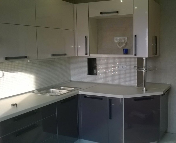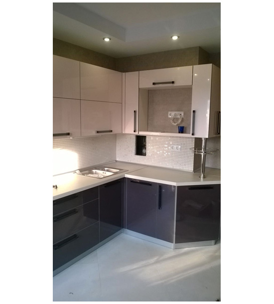 Угловая кухня выполнена в мягких тонах, которые наполнят помещение уютной и легкой атмосферой. Двухцветное исполнение делает ее привлекательной. В комплект входит металлическая штанга с подставкой для фруктов.