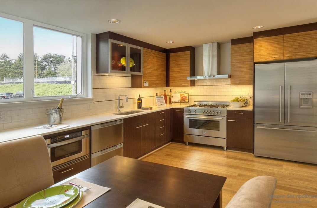 Угловая кухня 150х190 см с темными и светлыми фасадами.