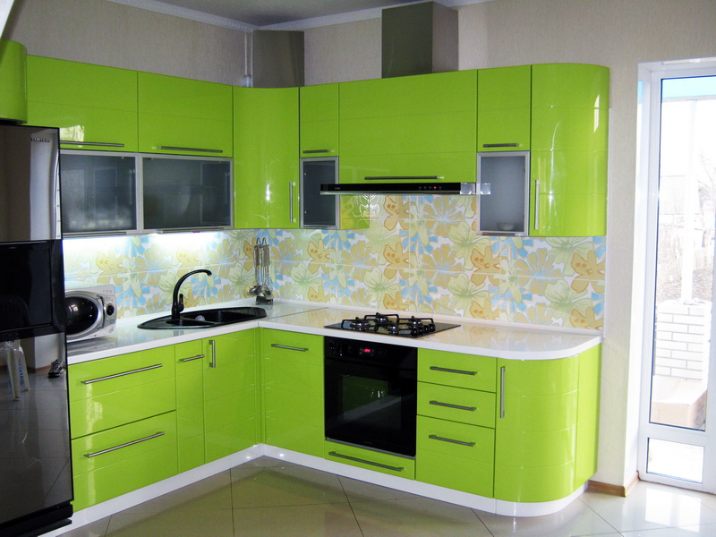 код 89388Радиусные глянцевые фасады с полупрозрачными вставками и белой столешницей.
