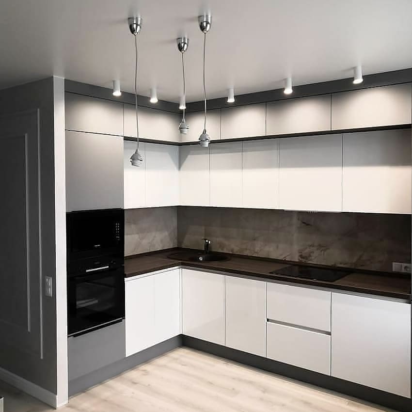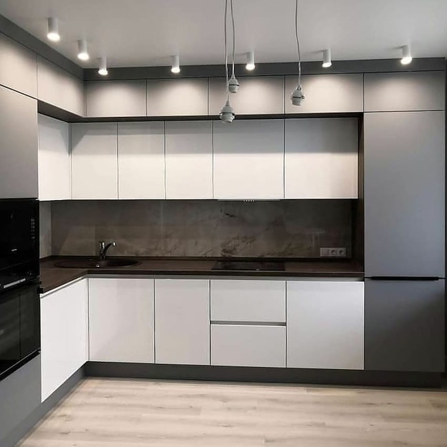 Стильная и современная кухня с матовыми фасадами без ручек.