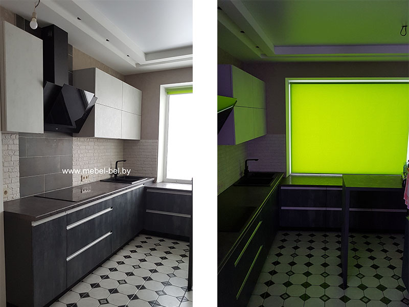 Угловая модульная кухня с интегрированными ручками. Верх выполнен в белом цвете, нижние фасады в цвете графита с мокрым эффектом. Кухня габаритная. отлично подойдет для средних и больших помещений. Функционал на высоком уровне - шкафчики и отсеки сохранят все необходимые кухонные принадлежности.