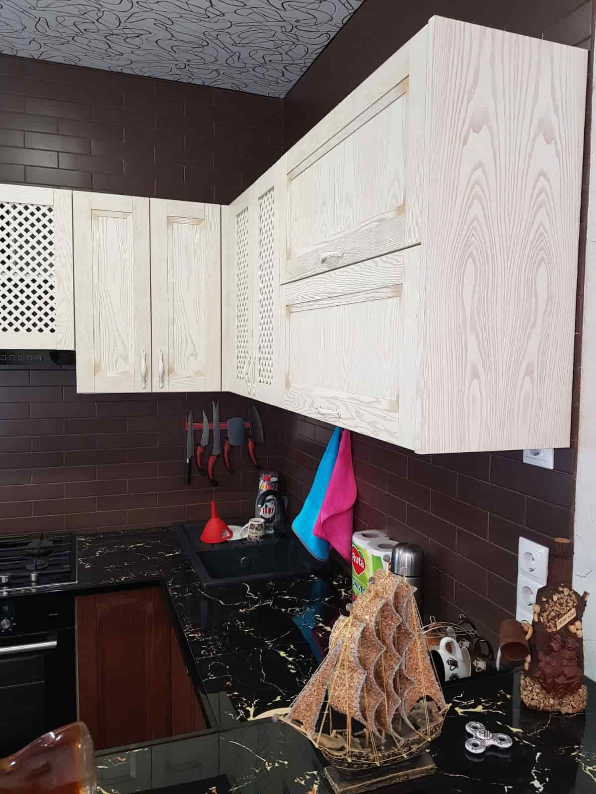 Угловая кухня с компактными подвесными шкафчиками, комбинированные фасады, удобная фурнитура.