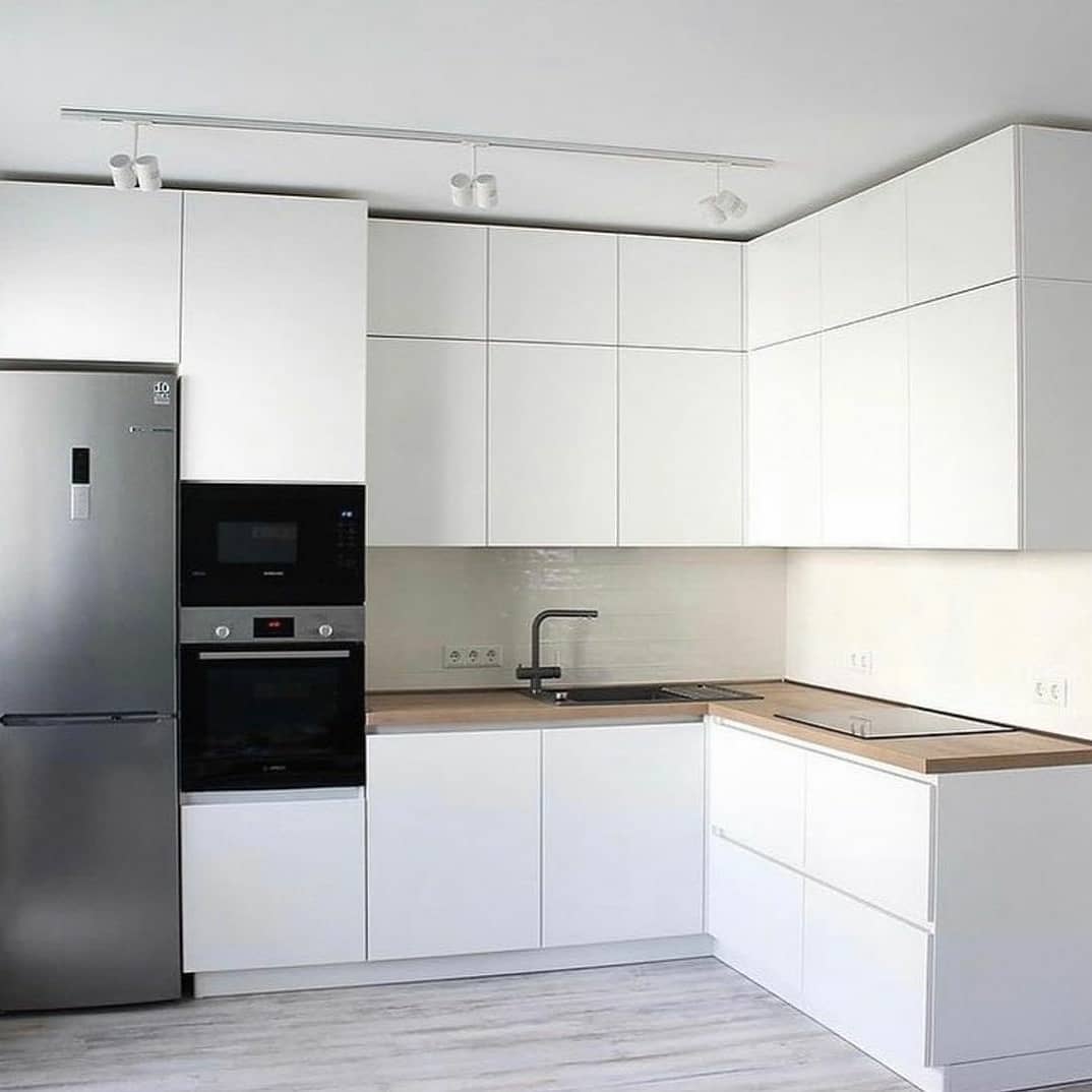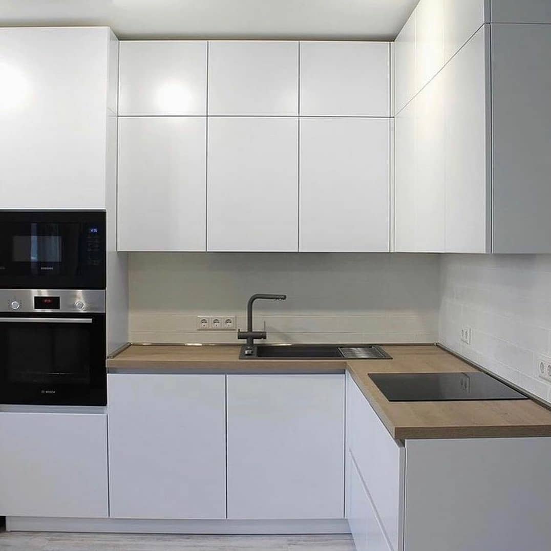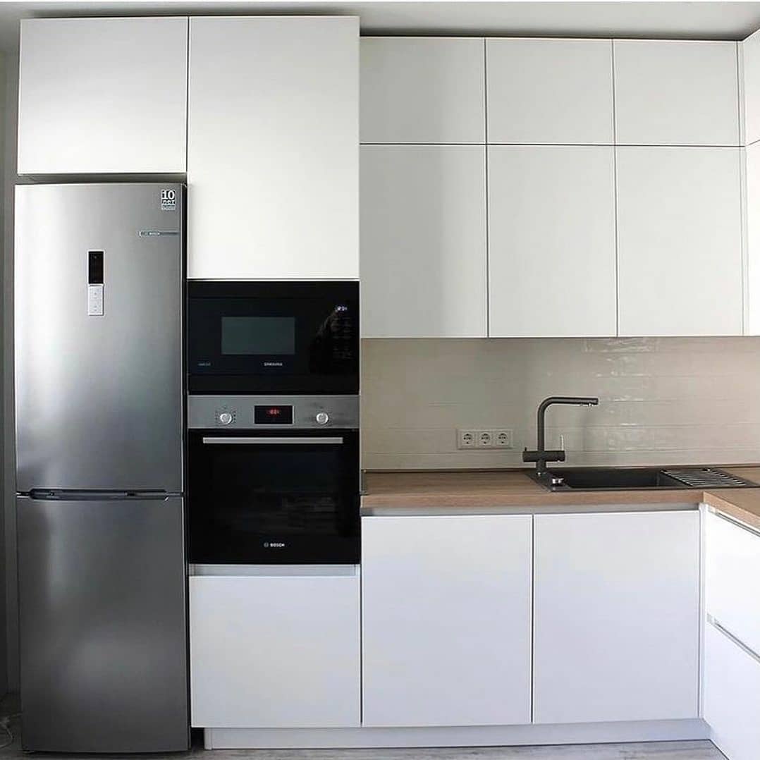 Угловая кухня со светлыми фасадами без ручек. Ниши для техники. Подсветка рабочей зоны.