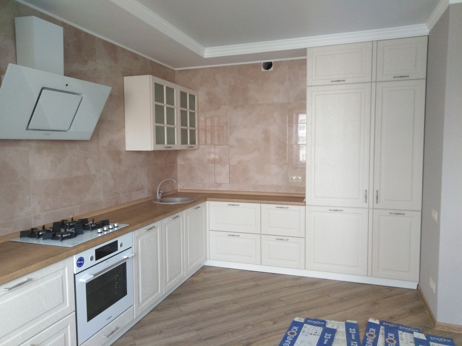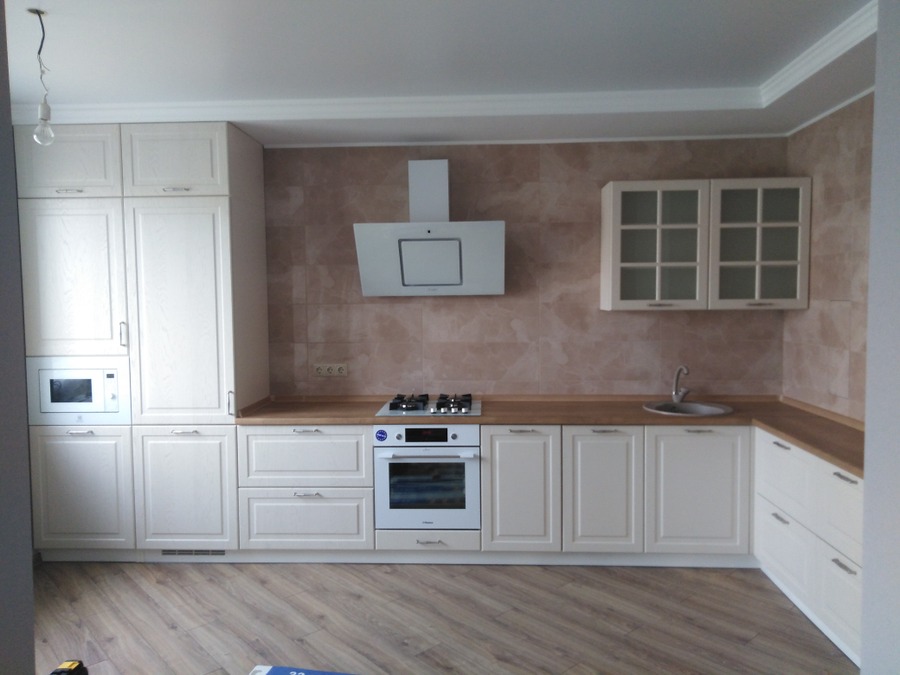 Длина кухни: 3.4х1.4 м. Материал фасада: пластик.