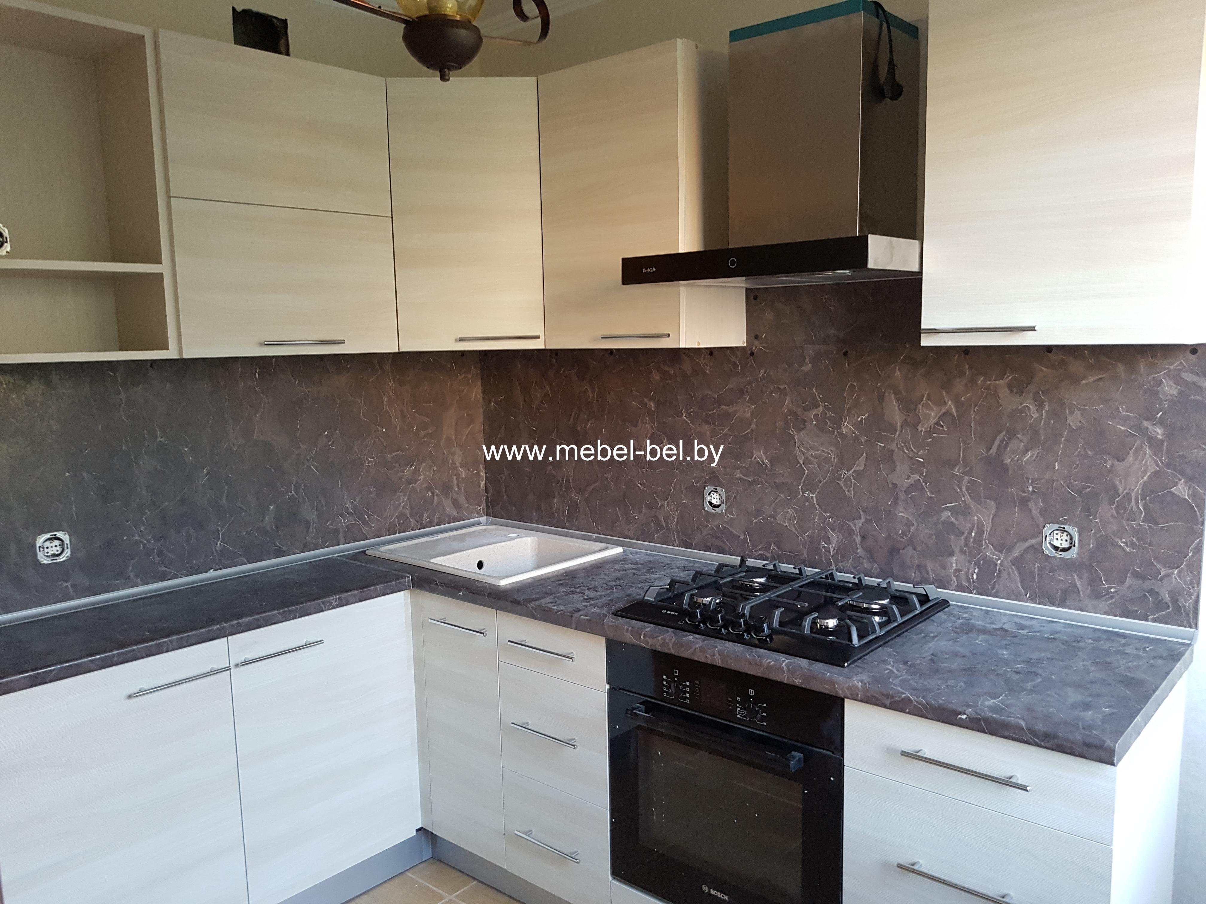 Изысканный угловой кухонный гарнитур из пластика с фасадами, стилизованными под дерево. Гарнитур дополнен скиналью, что придает ему завершенный вид. Столешница выполнена в имитации мрамора, что добавляет элегантности интерьеру.