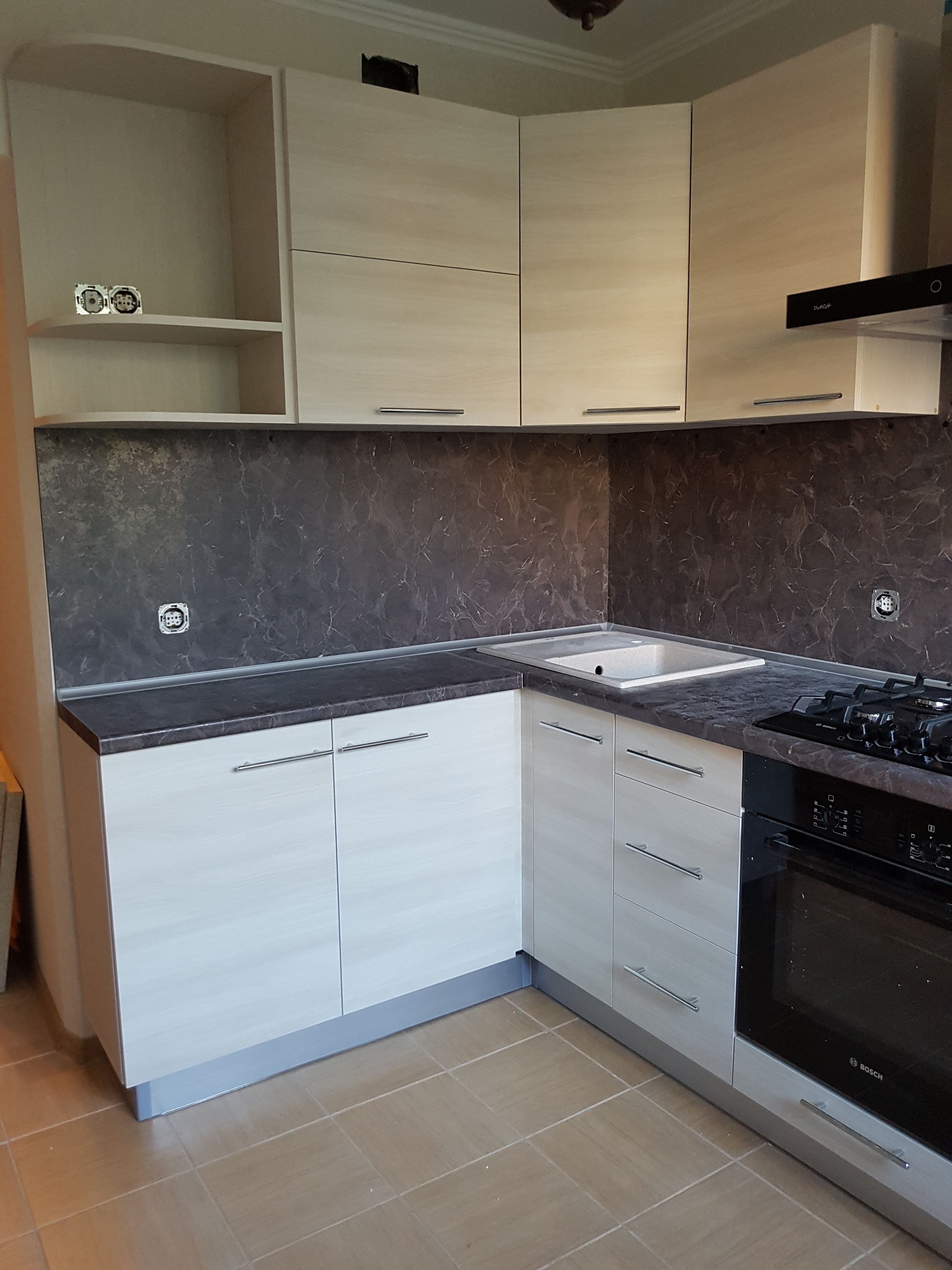 Темные и светлые фасады из пленочной МДФ. Ширина кухни 220 см.