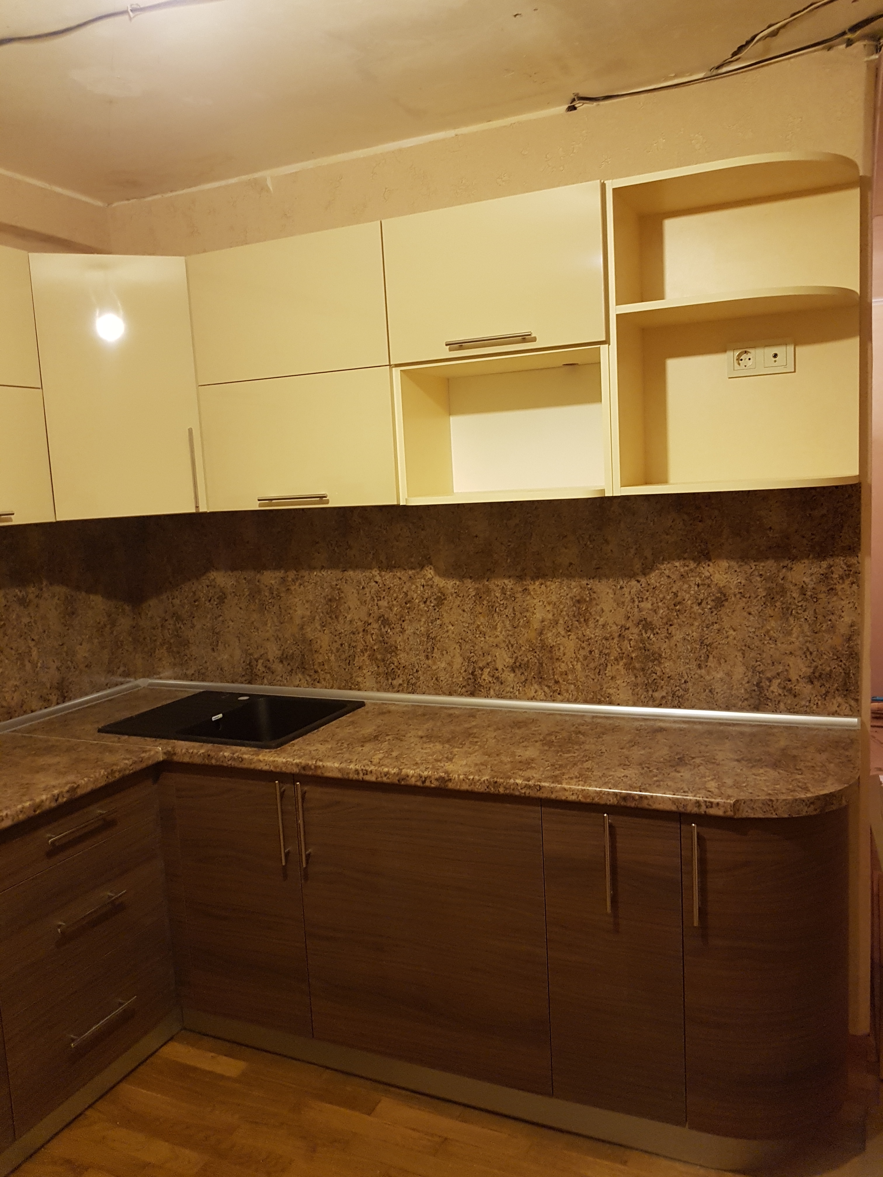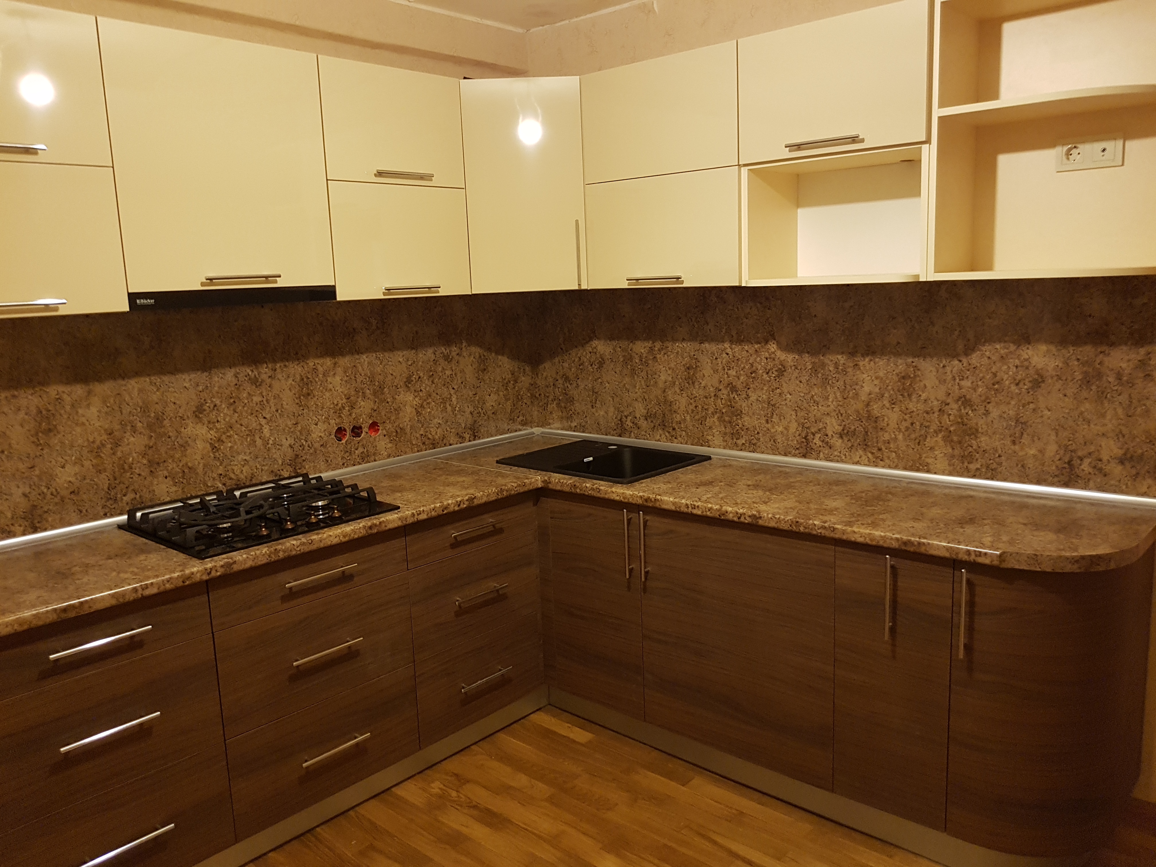 Фасады кухни исполнены в сочетании бежевого цвета и декора под древесную текстуру. Столешница оборудована пространством под раковину и плиту, а также вместительной зоной для готовки, в которой есть возможность разместить все необходимые продукты и кухонную утварь. Столешница со скругленными углами помогает избегать риска травм.