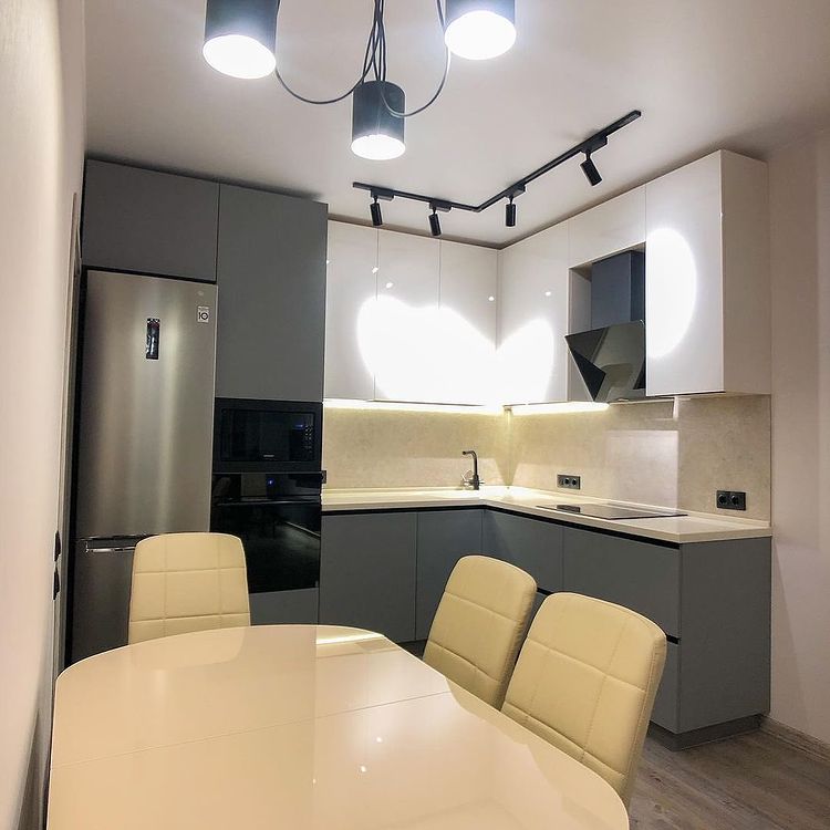Оригинальная угловая кухня в контрастной расцветке. Комбинированные фасады.