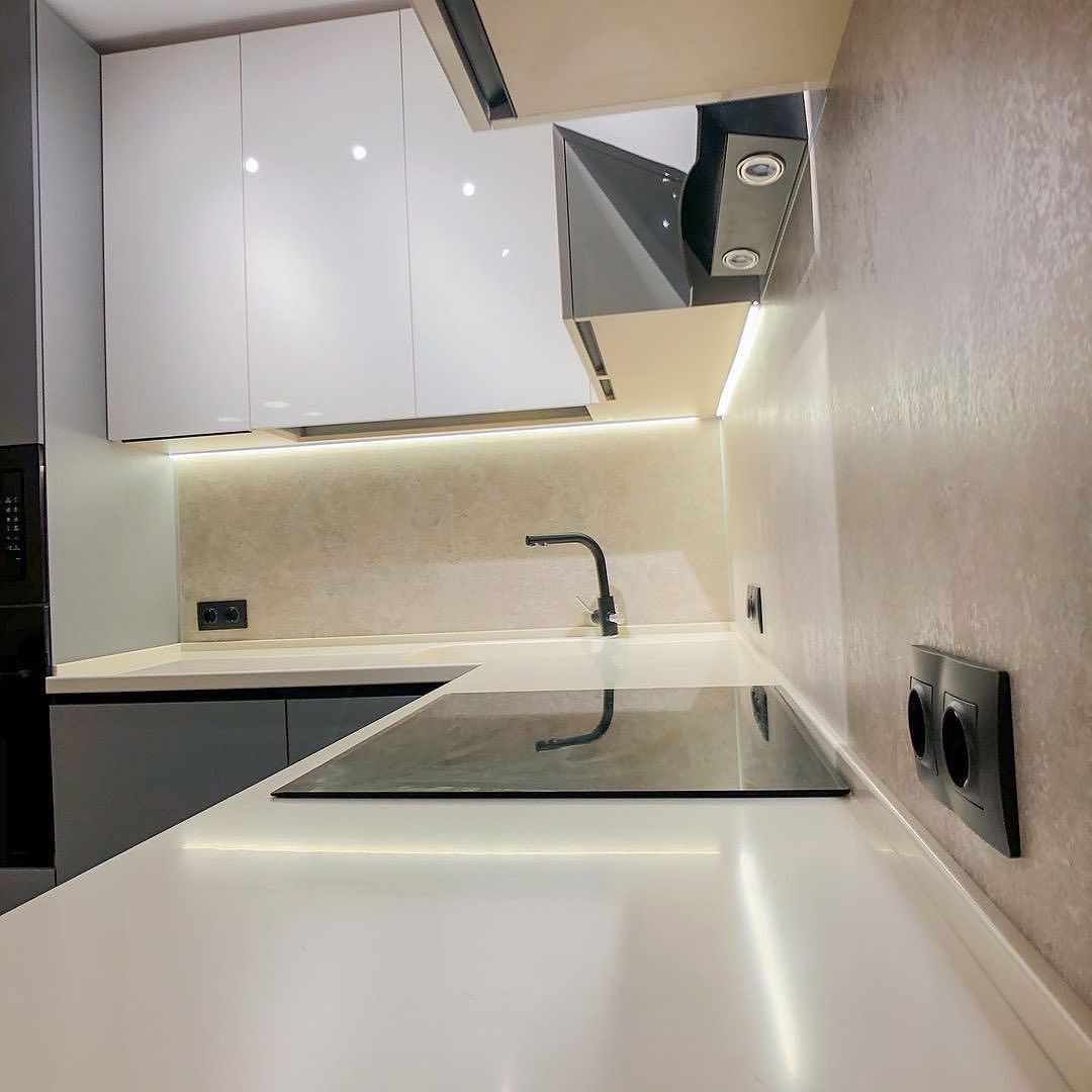 Матовые фасады без ручек. Цвет: белый/серый. Пенал для техники.