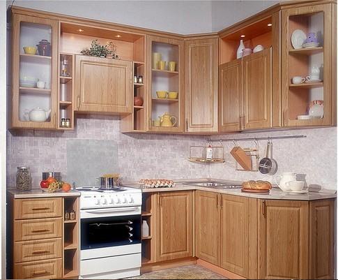 Широкая угловая кухня из ДСП. Навесные шкафы украшены вставками из матового стекла.