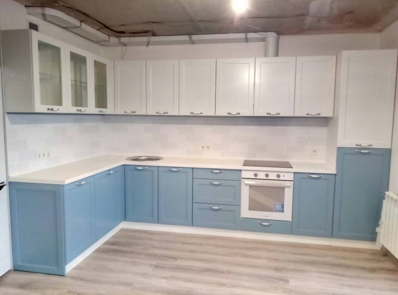 Угловой кухонный гарнитур в бело-голубых тонах