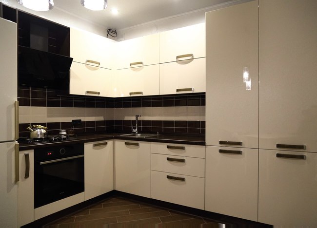 Фасады глянцевые белого цвета без ручек, подсветка, полки.